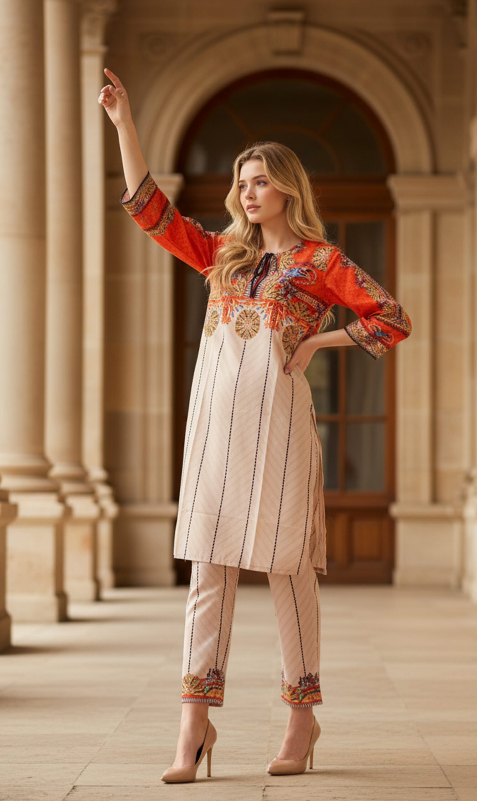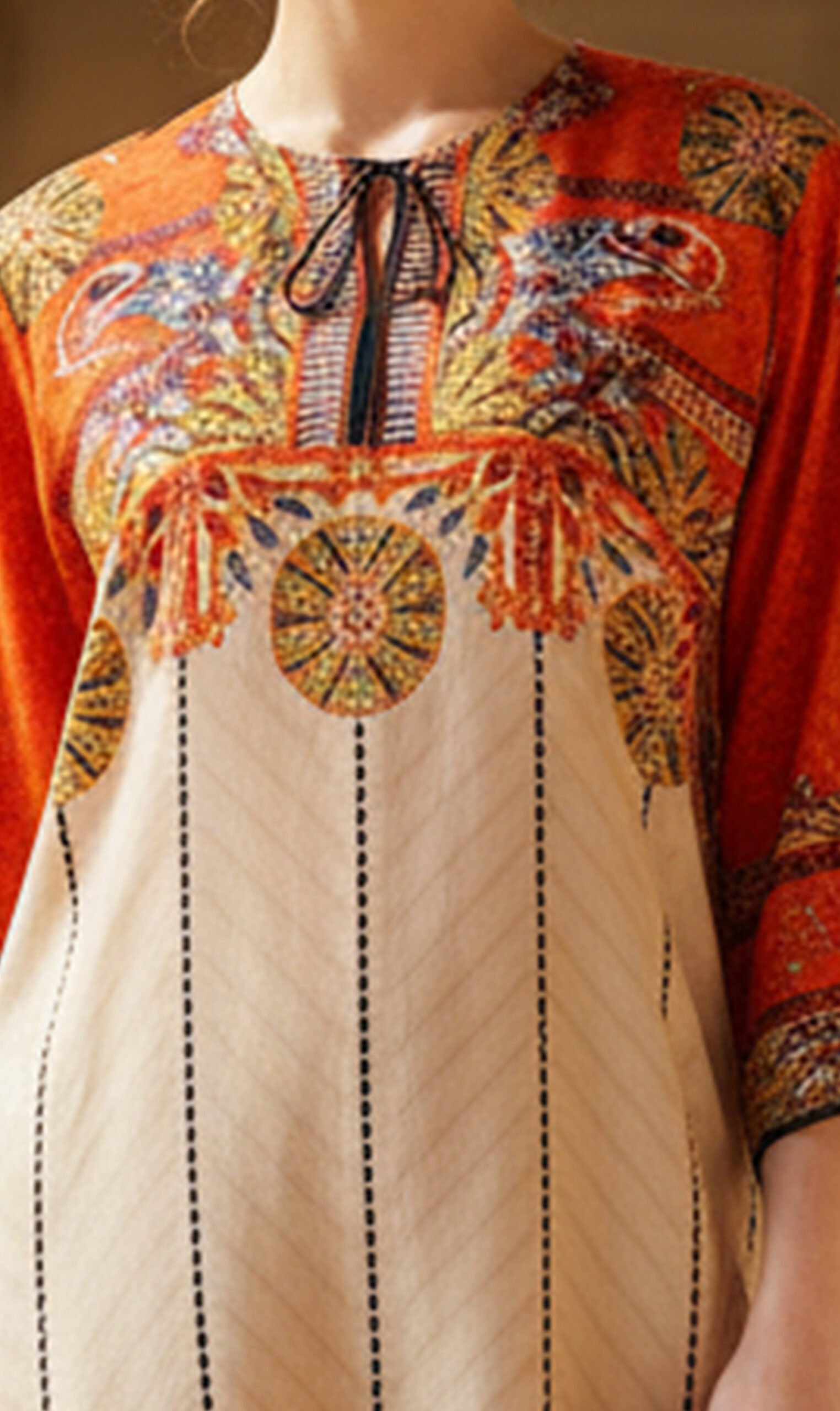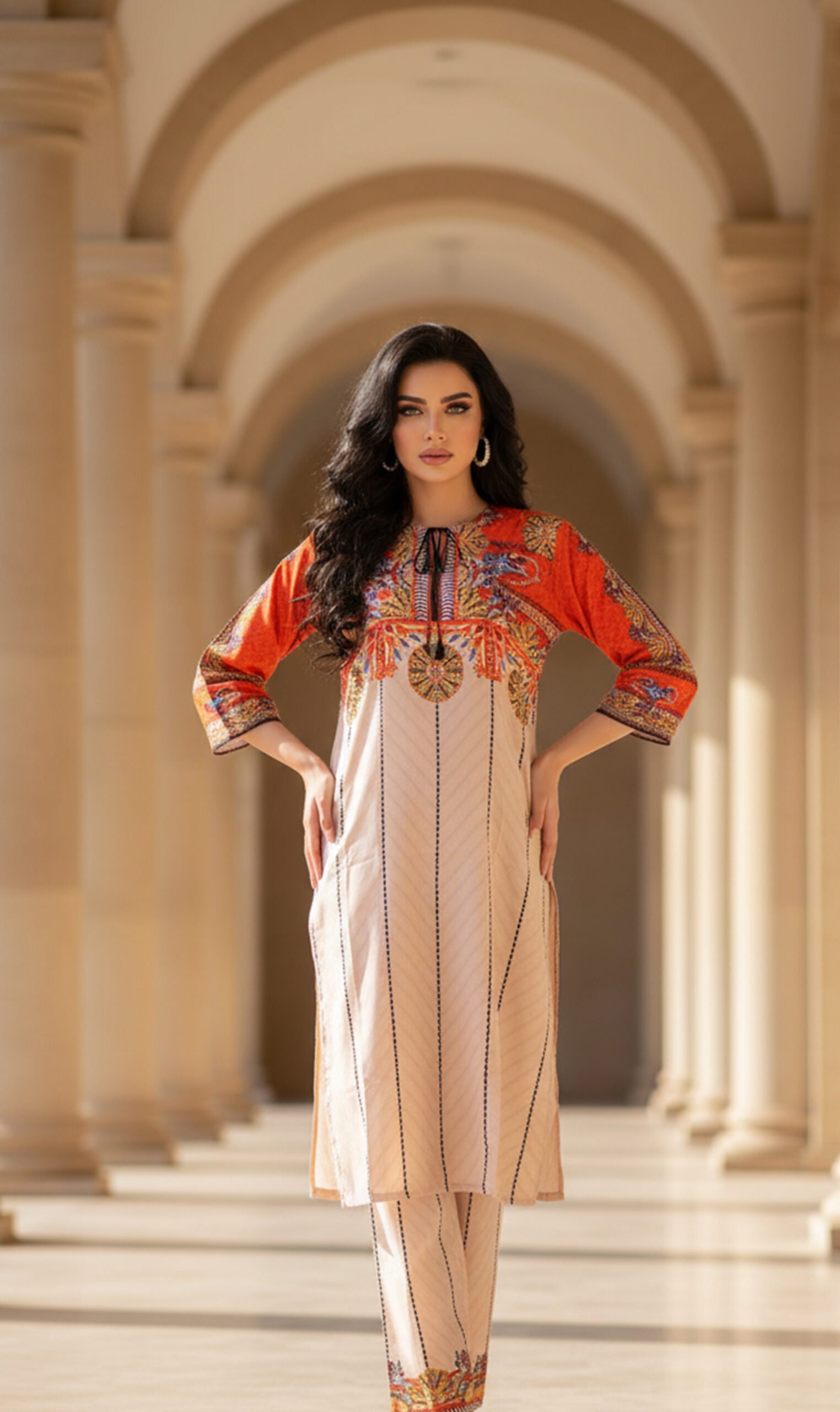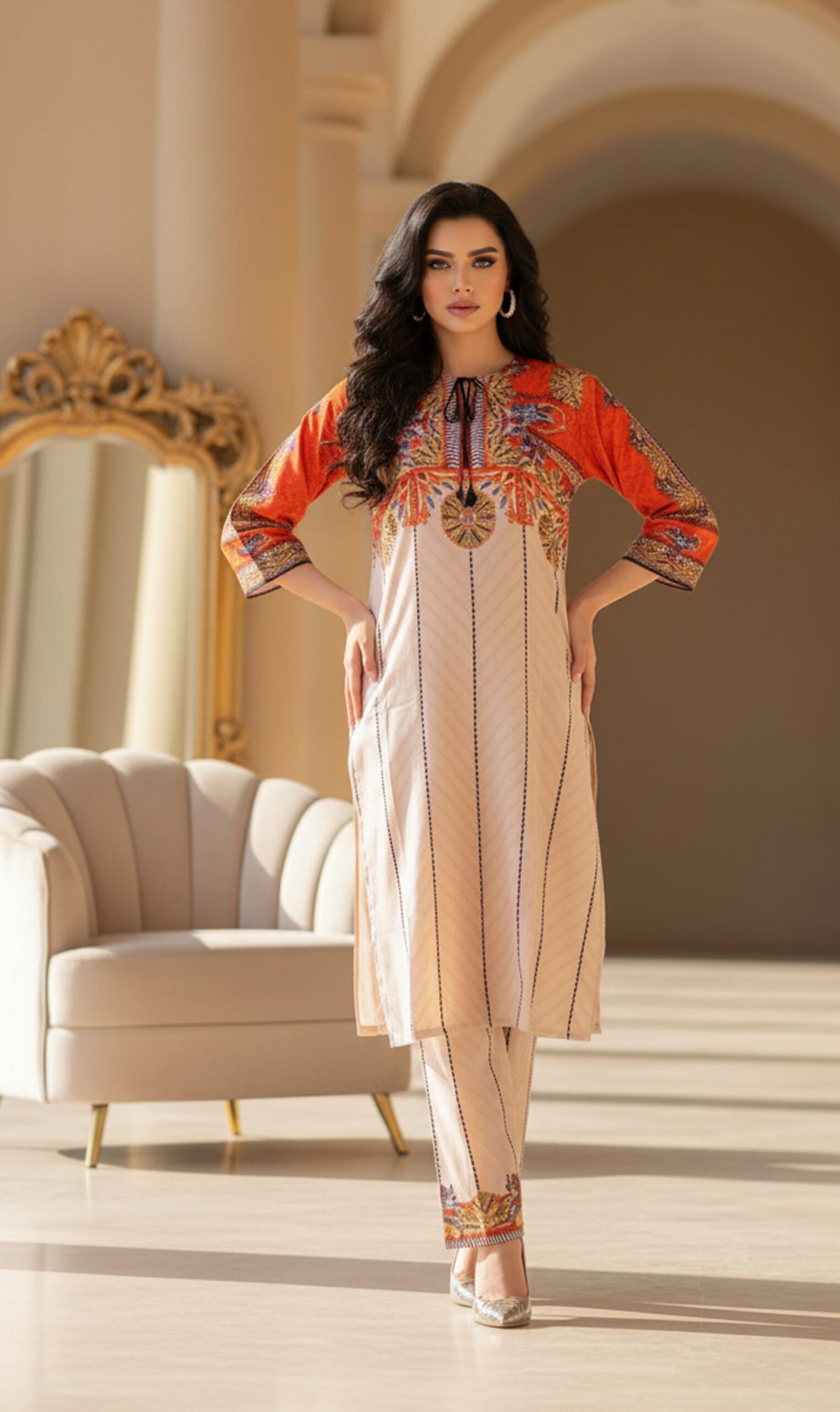 Elevate your wardrobe with this graceful silk outfit from Dua Fashion Corner. Crafted from premium silk fabric, this design combines elegance with comfort. The outfit features a warm beige base enhanced with intricate digital prints in vibrant hues of orange, gold, and blue, creating a captivating contrast. The neckline is adorned with a charming tie-up detail, while the sleeves showcase ornate patterns that add a festive flair. Perfect for both daytime elegance and evening sophistication.