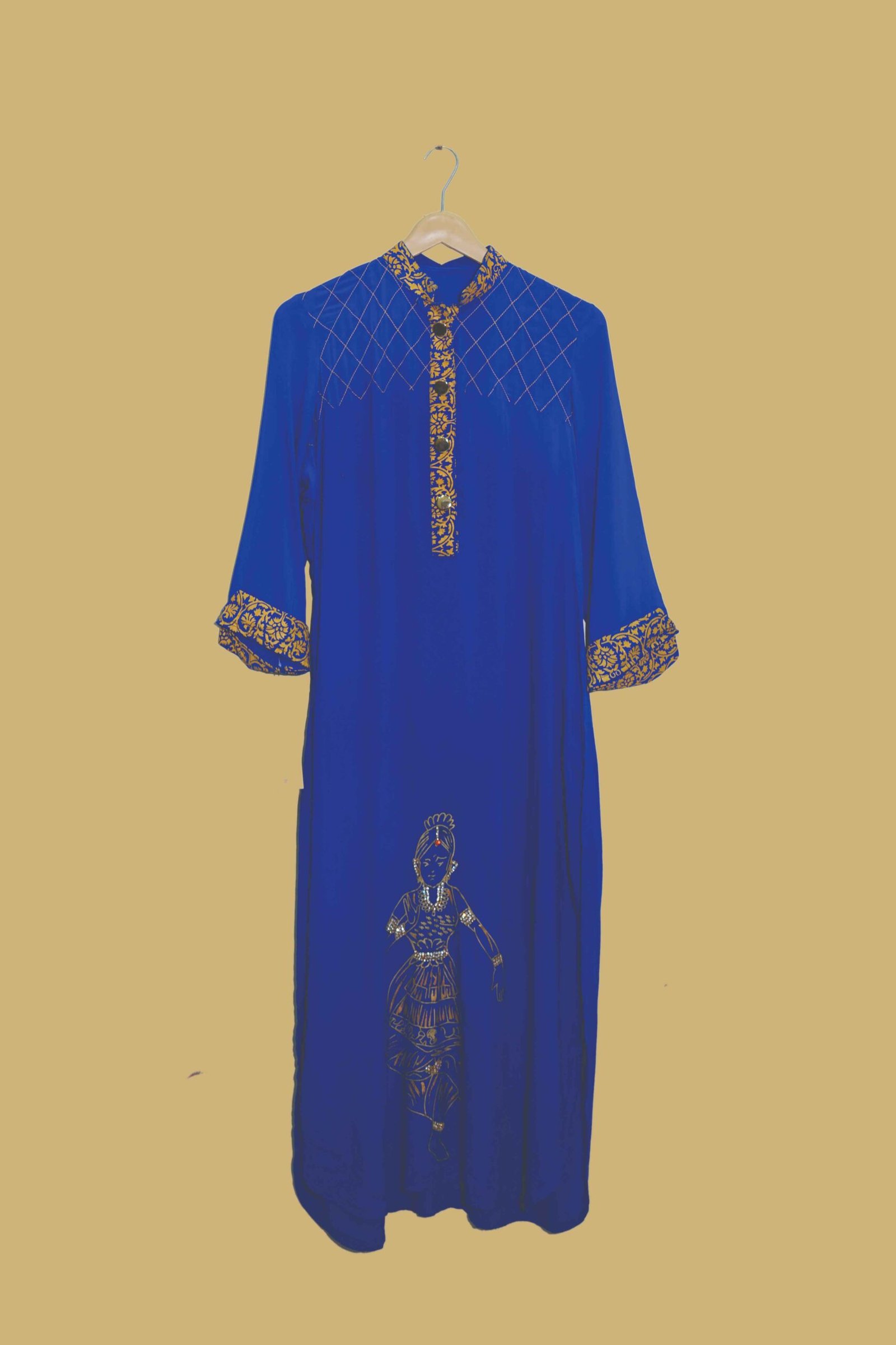 Make a bold and graceful impression with this royal blue straight-cut kurti from Dua Fashion Corner, beautifully detailed with artistic ethnic prints and stitched patterns.