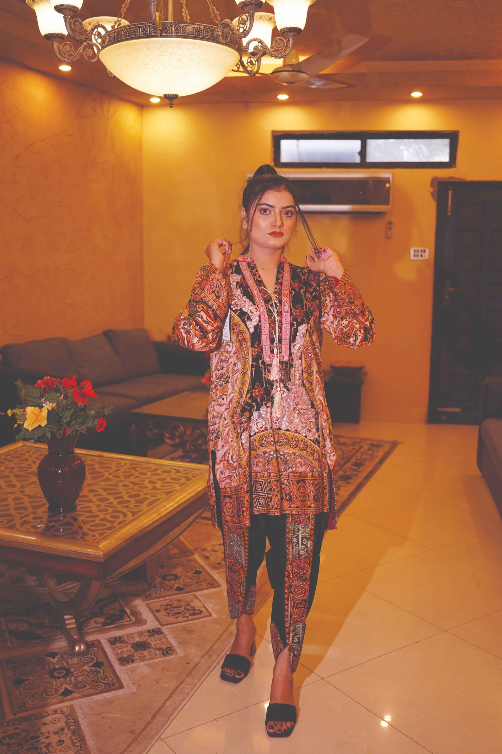 Bring tradition to life with this richly designed printed suit by Dua Fashion Corner, crafted for those who appreciate cultural aesthetics with a modern twist. From the vibrant colors to the intricate detailing, this ensemble makes a bold yet classy impression.