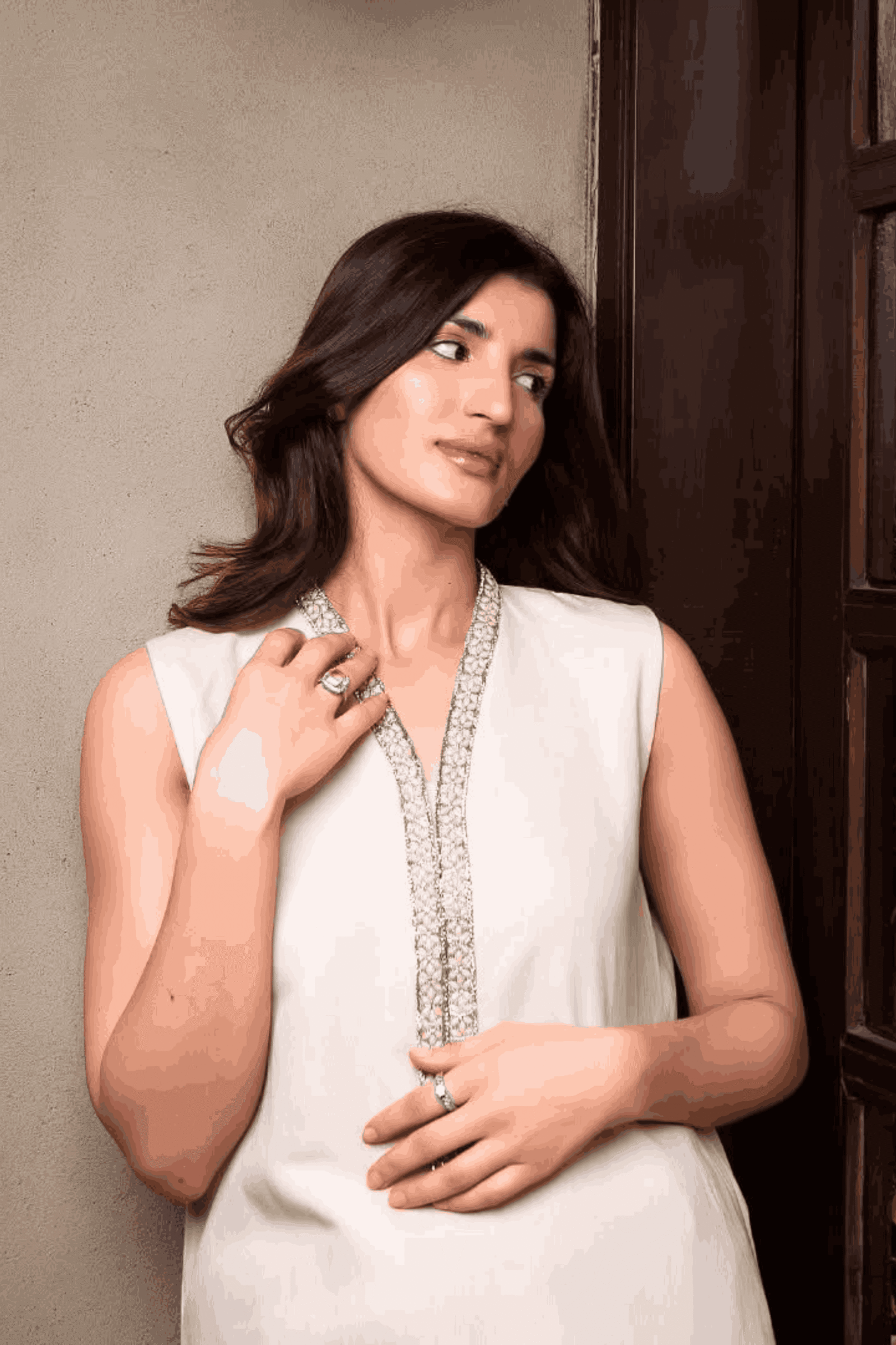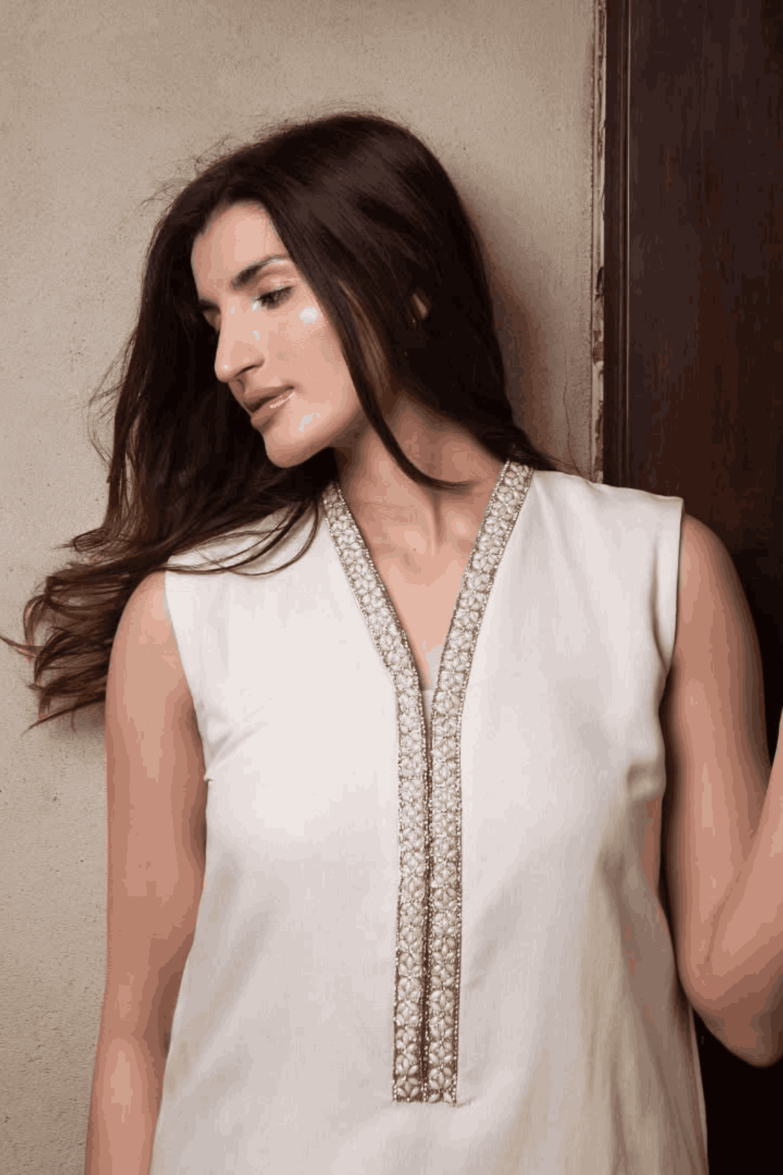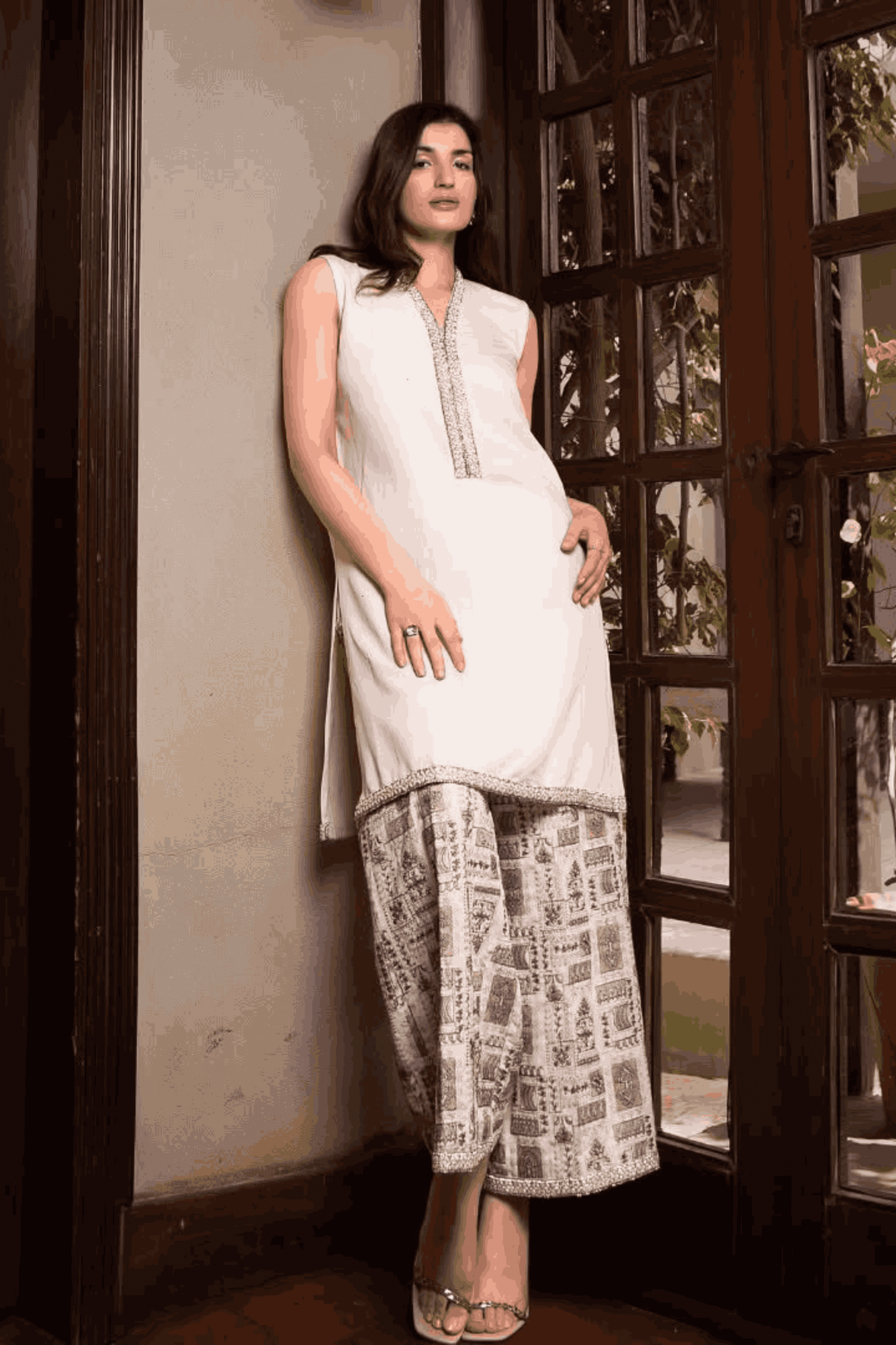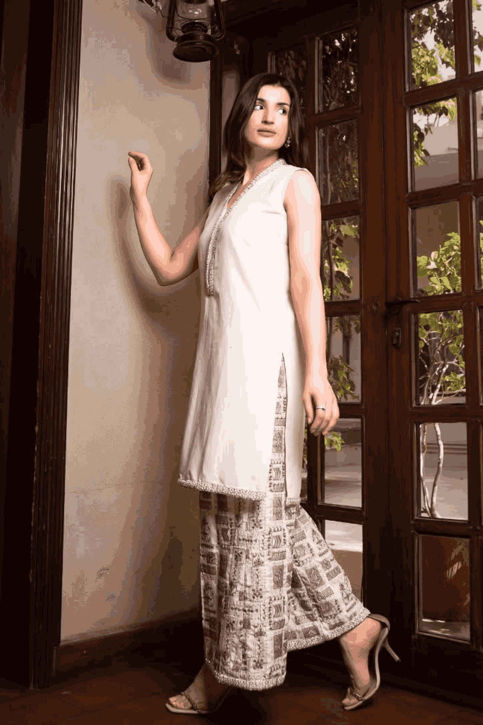 Embrace the fresh elegance of Sahar. This pristine white dress features a sleeveless V-neck shirt adorned with vibrant threadwork on the flared pants, complemented by delicate lace trim on the hem. Perfect for embracing the dawn of a new day, Sahar blends modern charm with a touch of traditional craftsmanship.
