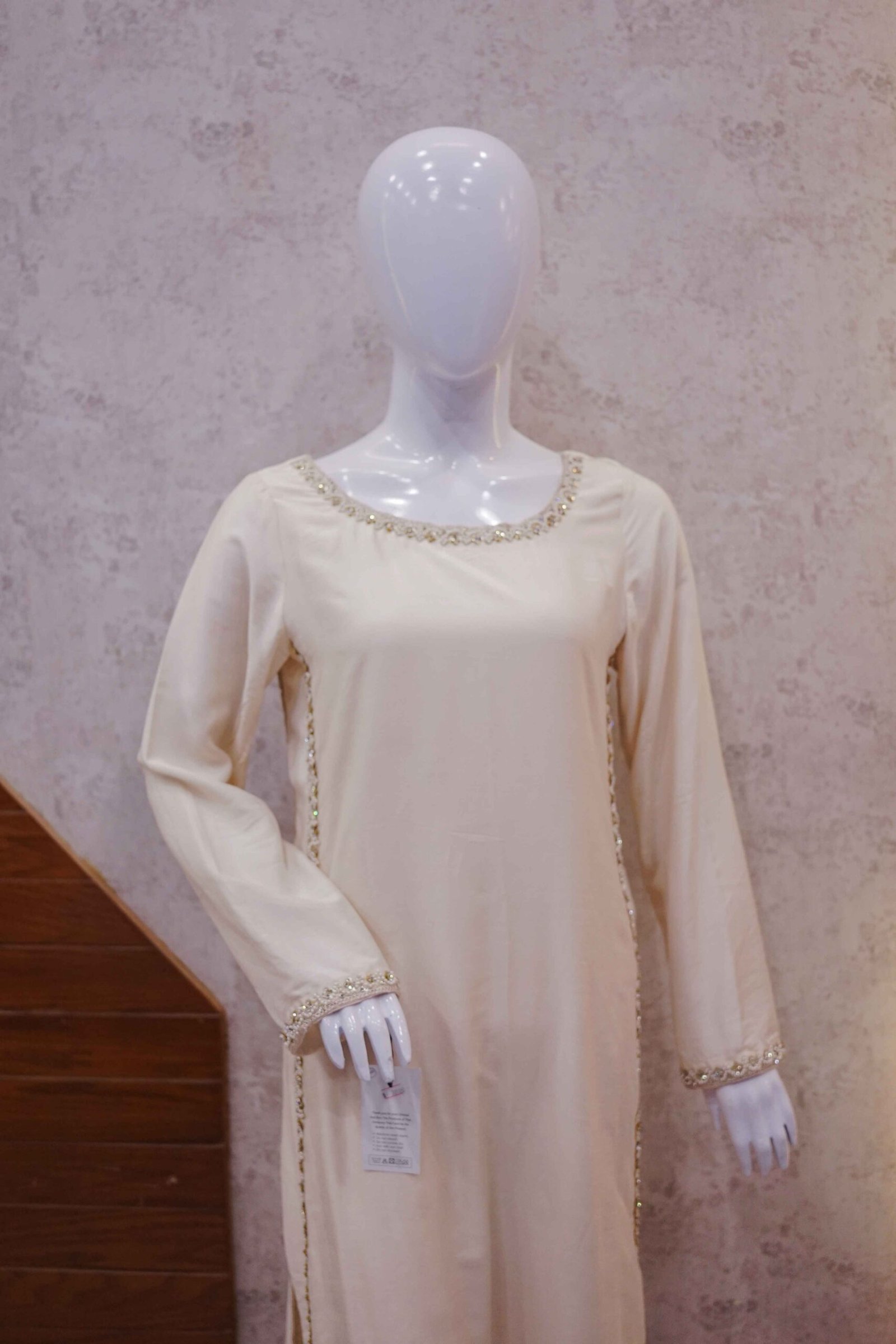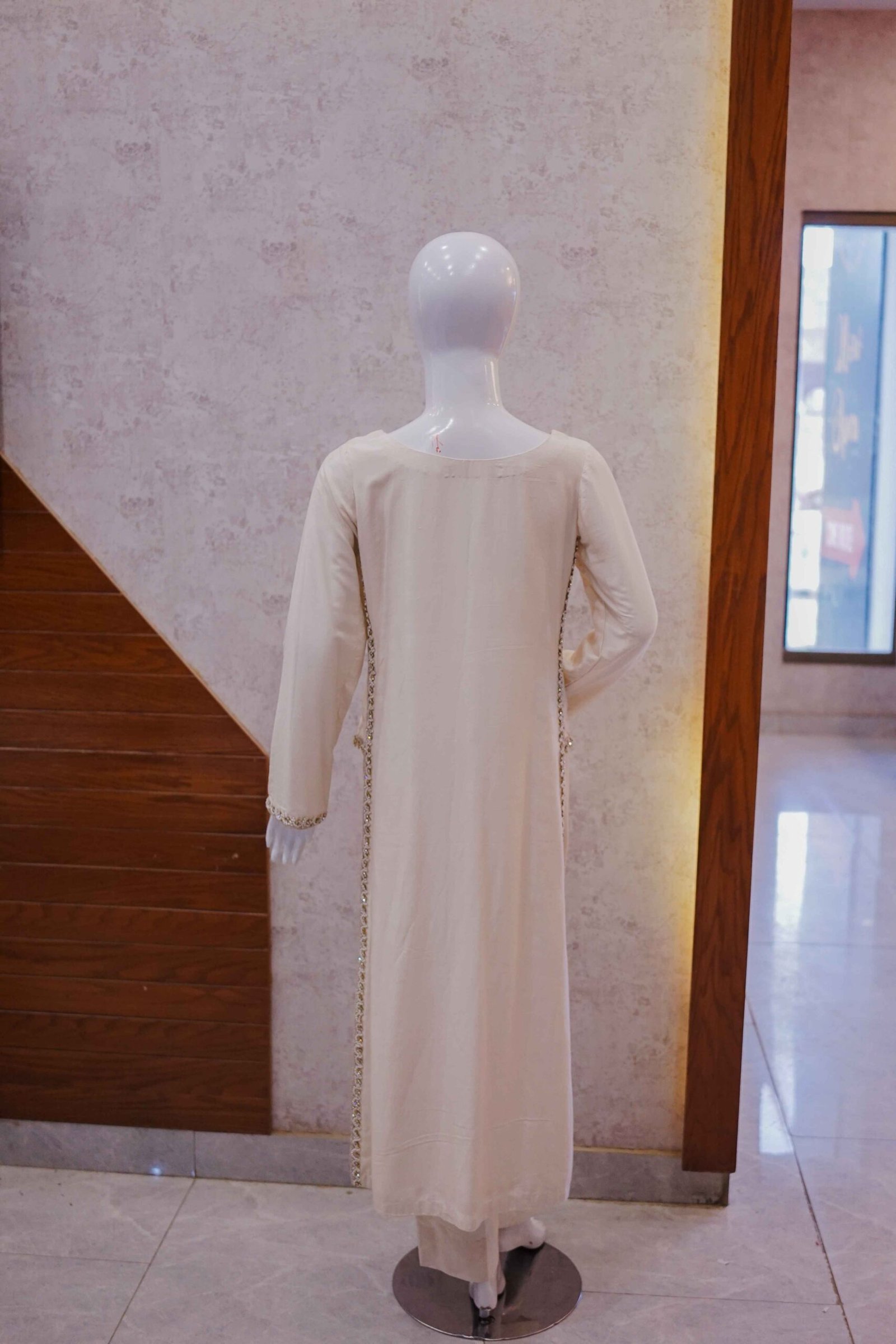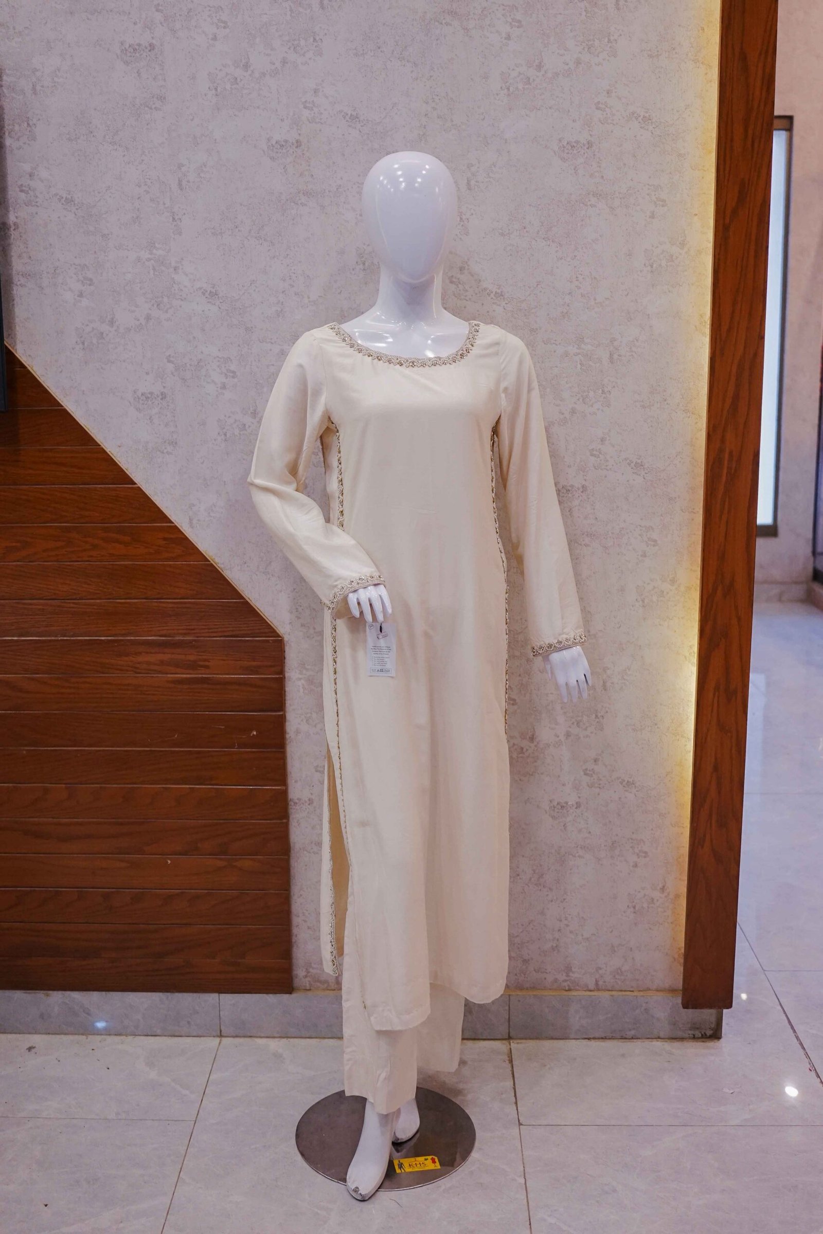 This 2-piece cream outfit from Dua Fashion Corner brings together traditional design with a modern minimalist twist. The outfit is stitched to perfection with fine lace detailing on the neckline, sleeves, and side slits, adding just the right touch of festivity to its clean look.