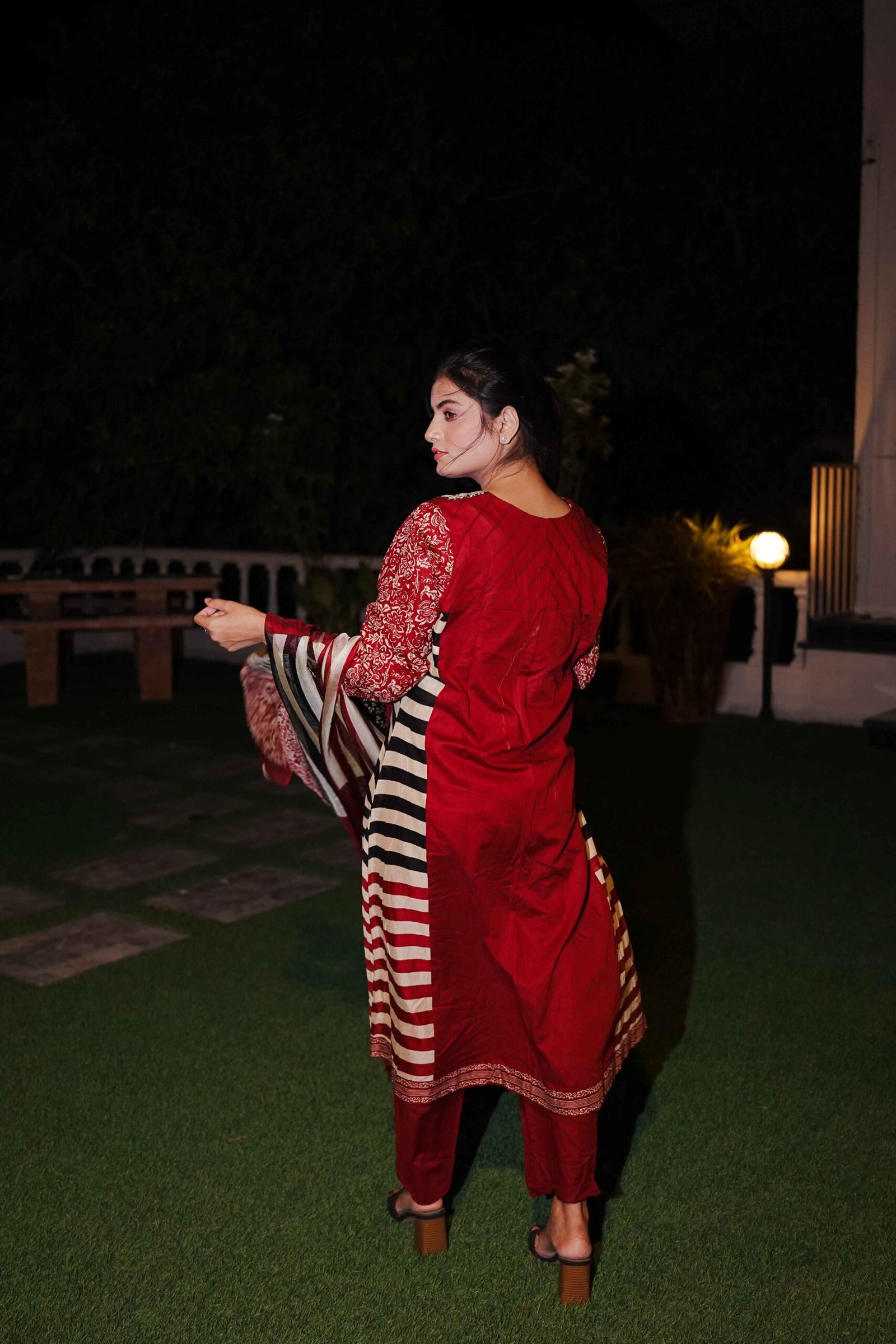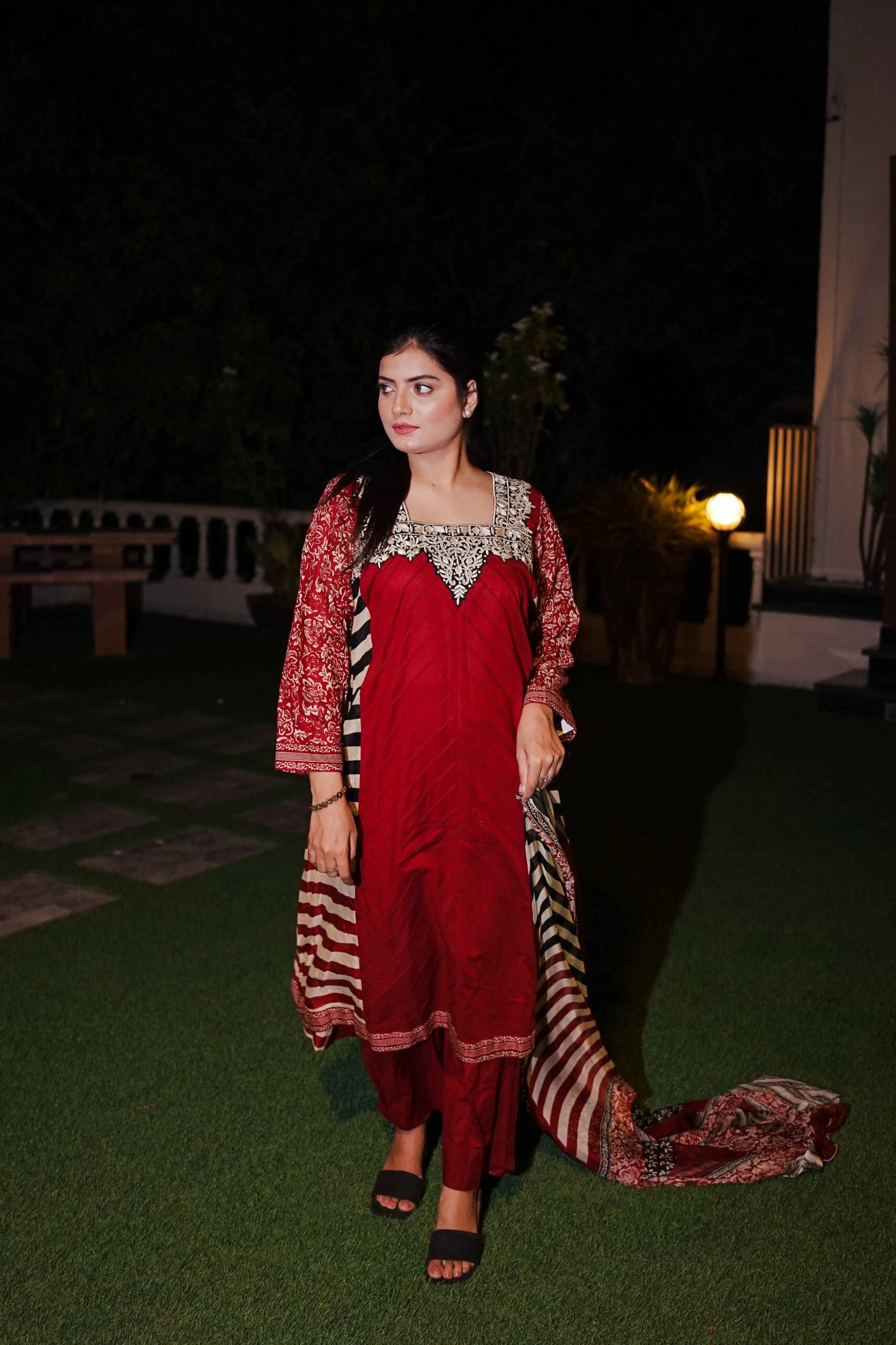 Unleash your inner royalty with Shahi Andaaz by Dua Fashion Corner, a captivating ensemble designed to make heads turn. The deep wine-maroon kameez features a stunning embroidered square neckline, drawing attention to its intricate threadwork. The printed sleeves add a classic touch, while the striped paneling and dupatta bring a fresh fusion vibe.