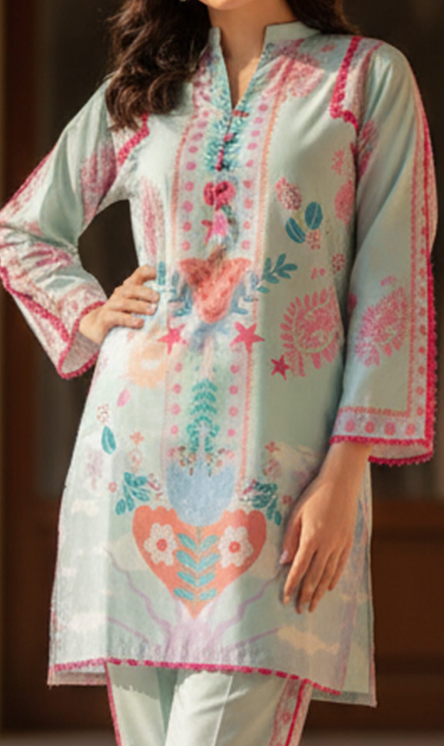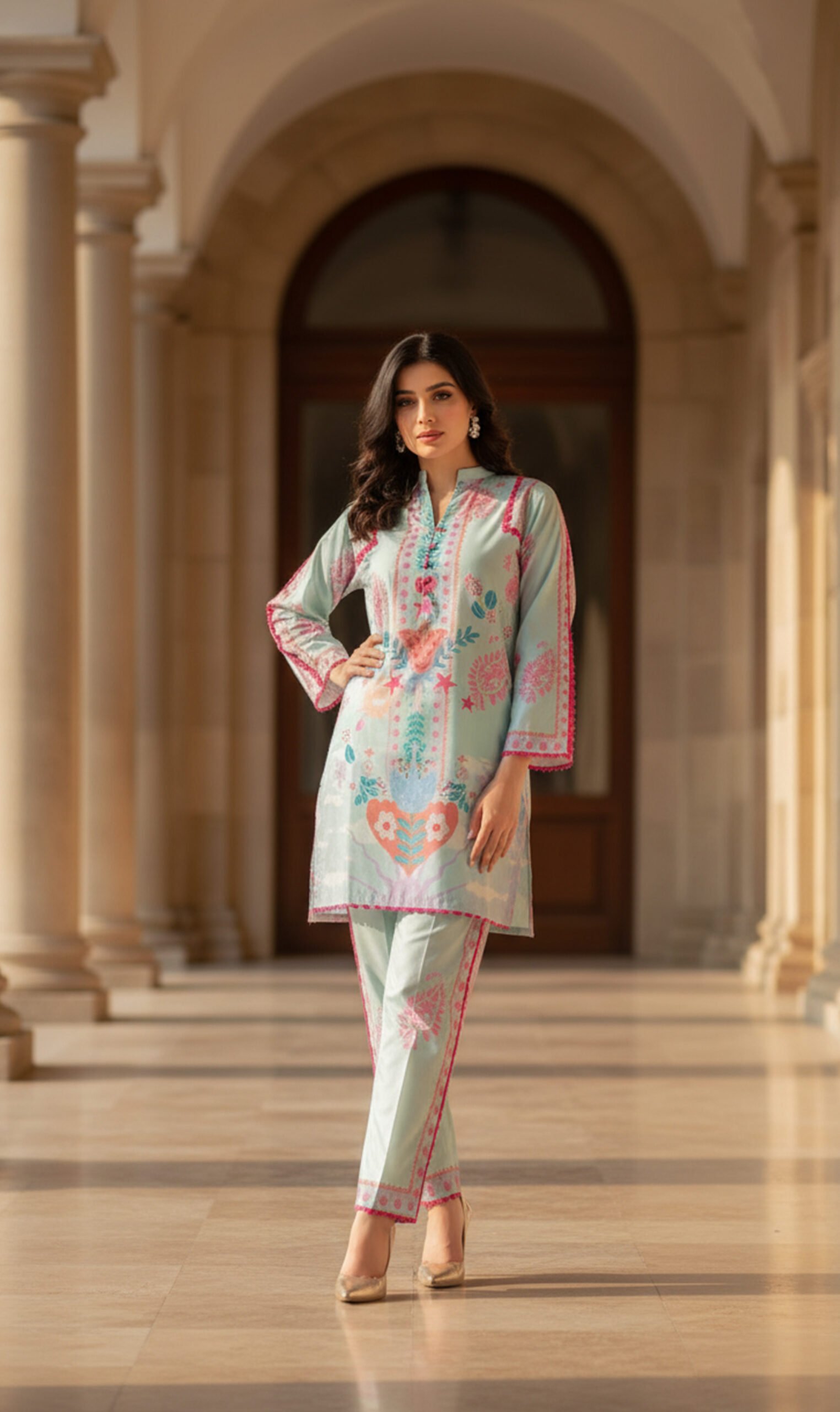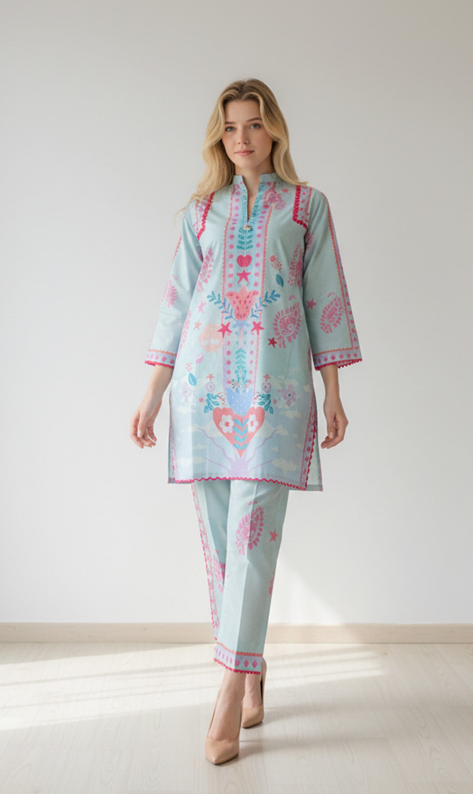 Experience the soft charm of Sky Bloom Elegance — a beautifully printed outfit from Dua Fashion Corner, crafted to bring freshness and grace to your wardrobe. The ensemble showcases a serene sky-blue base enhanced with pastel pink and coral motifs, creating a dreamy and youthful vibe.