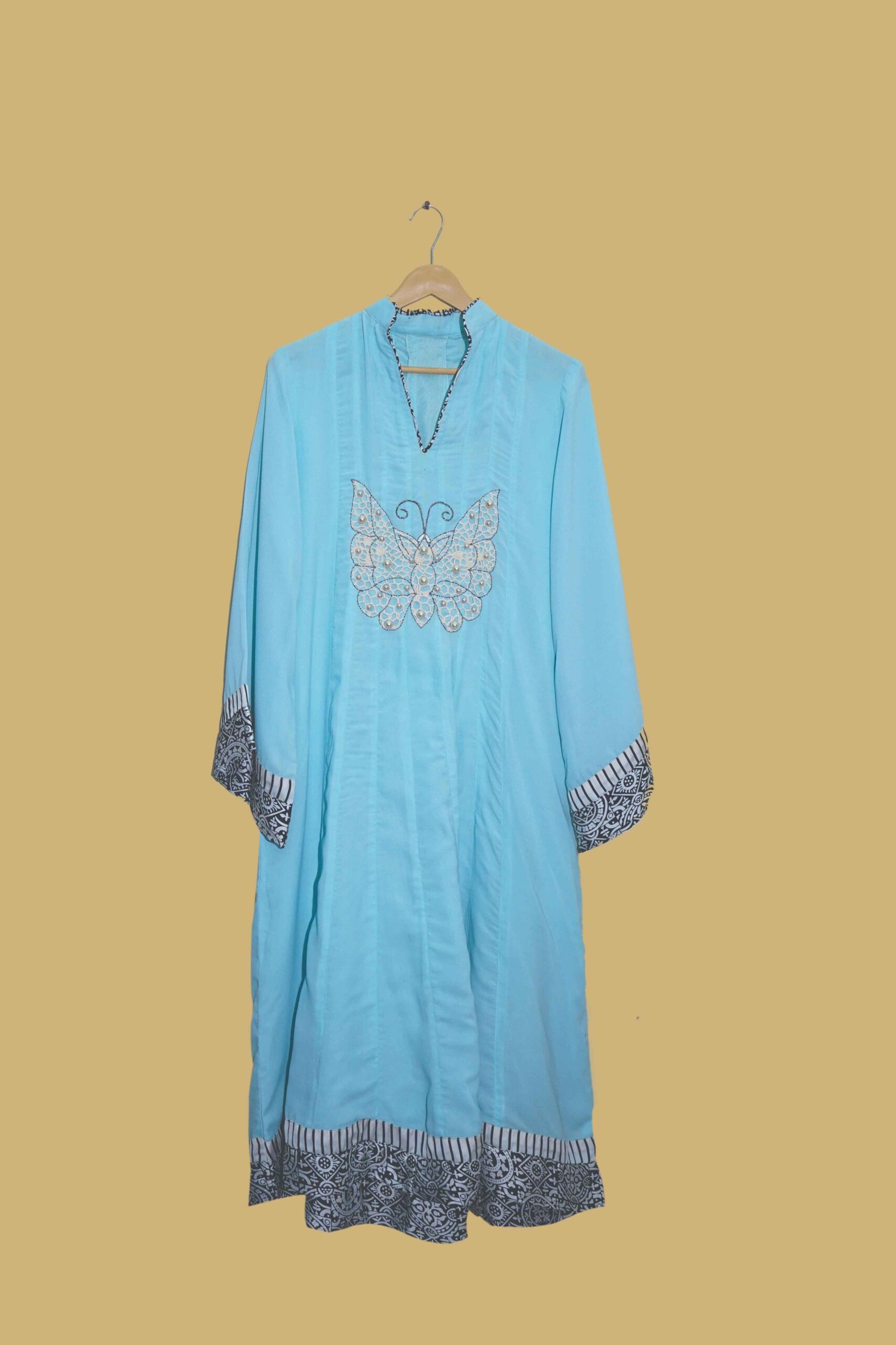 The centerpiece of this kurti is the intricate butterfly embroidery on the chest, delicately done in a mix of white and black threadwork that enhances the feminine look. The black & white printed border on the sleeves and hem adds a subtle traditional contrast, while the vertical pleated detailing along the front elongates the silhouette.