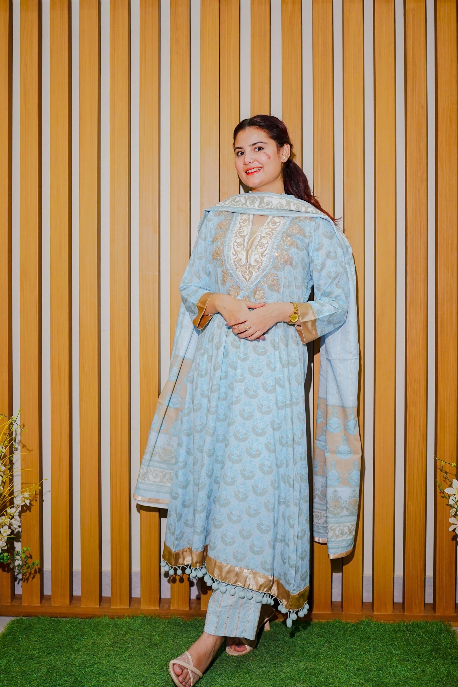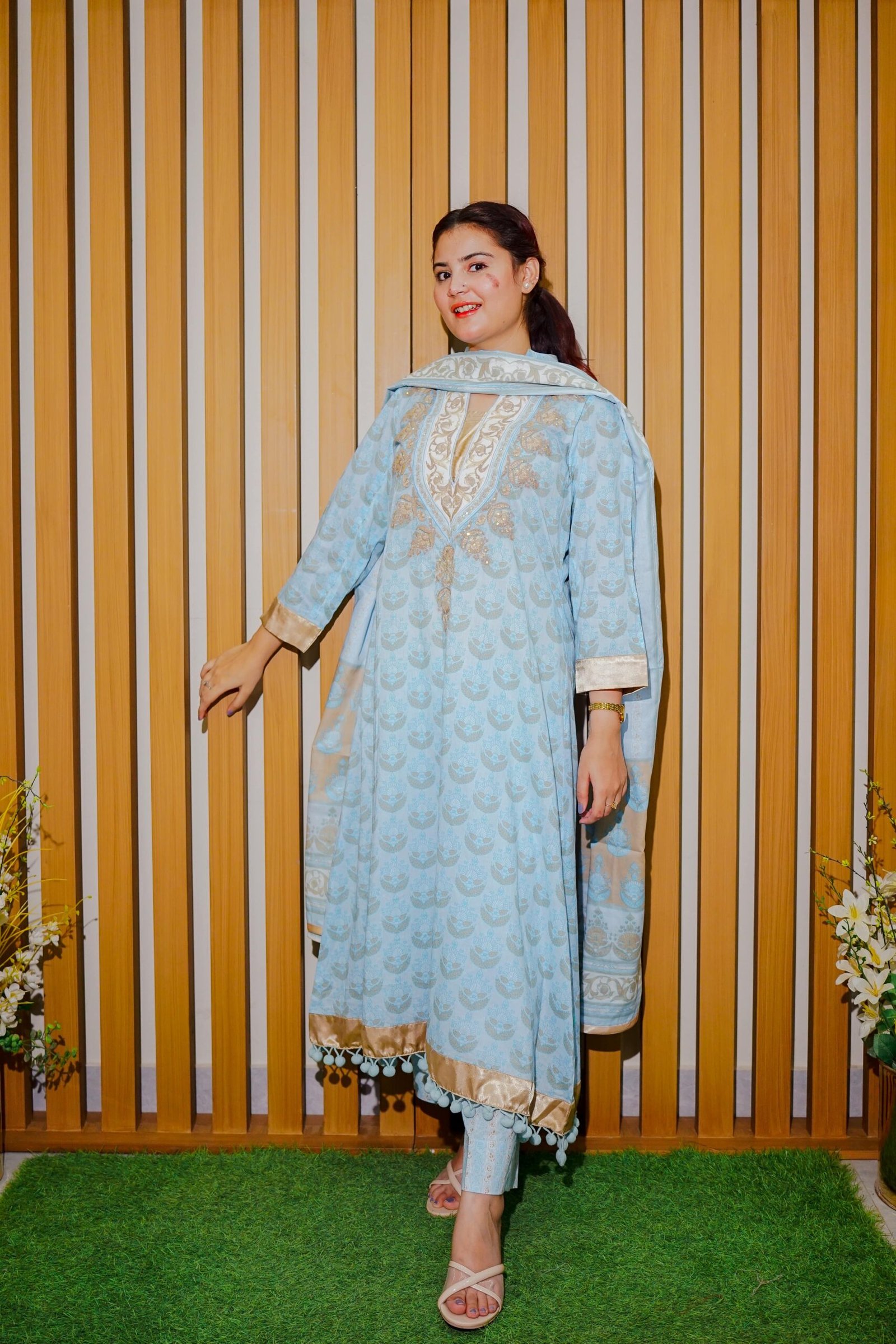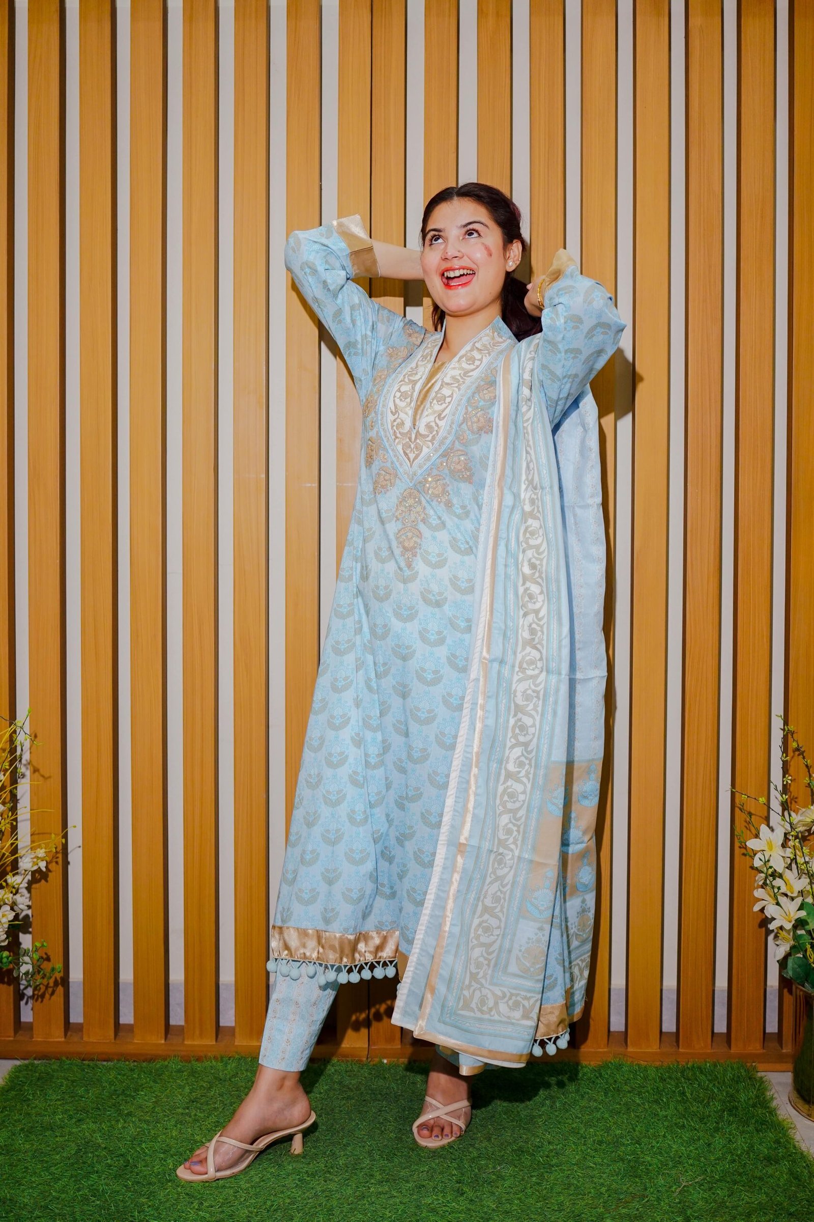 Color: Sky Blue with Beige & Gold Highlights