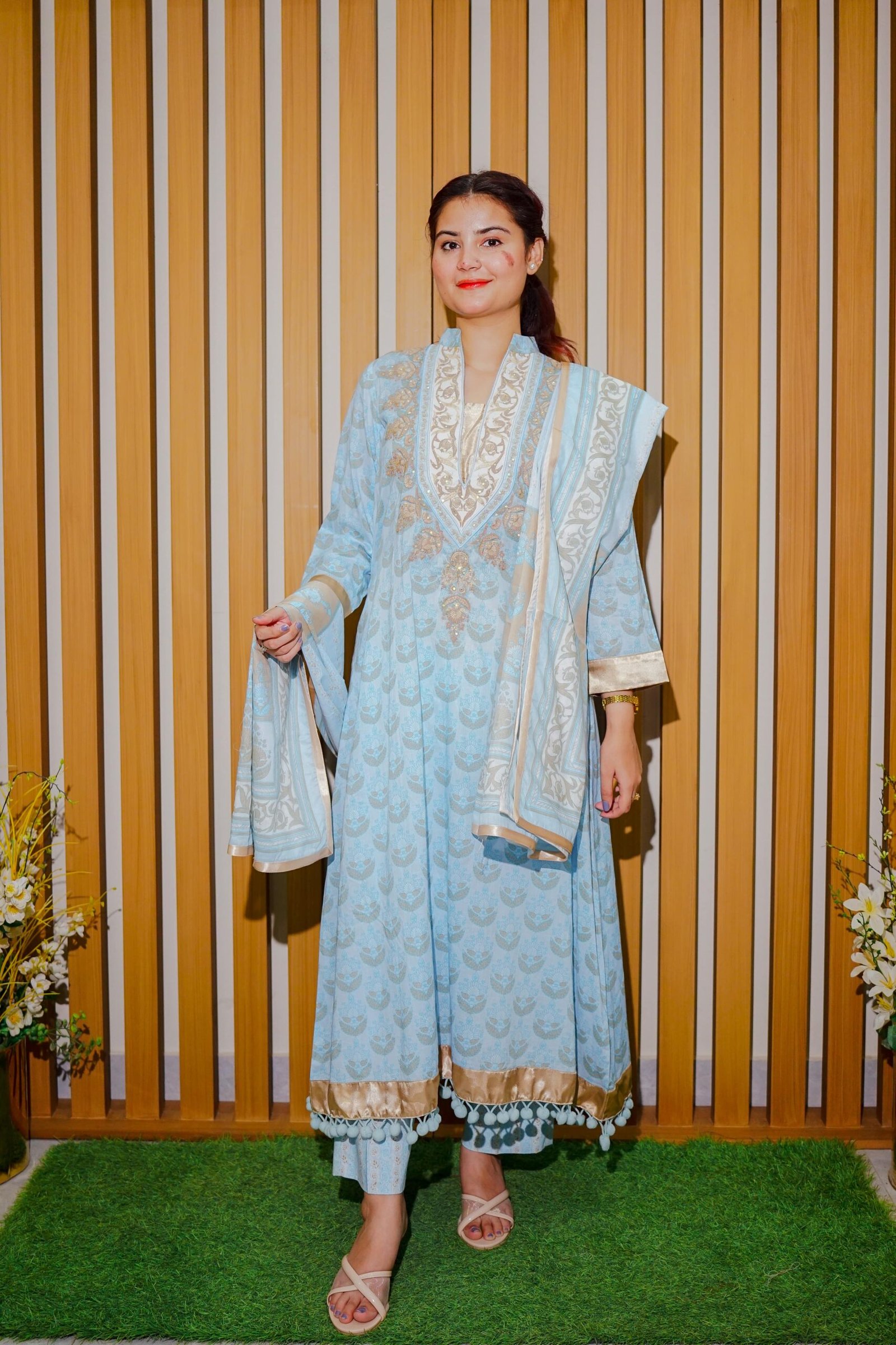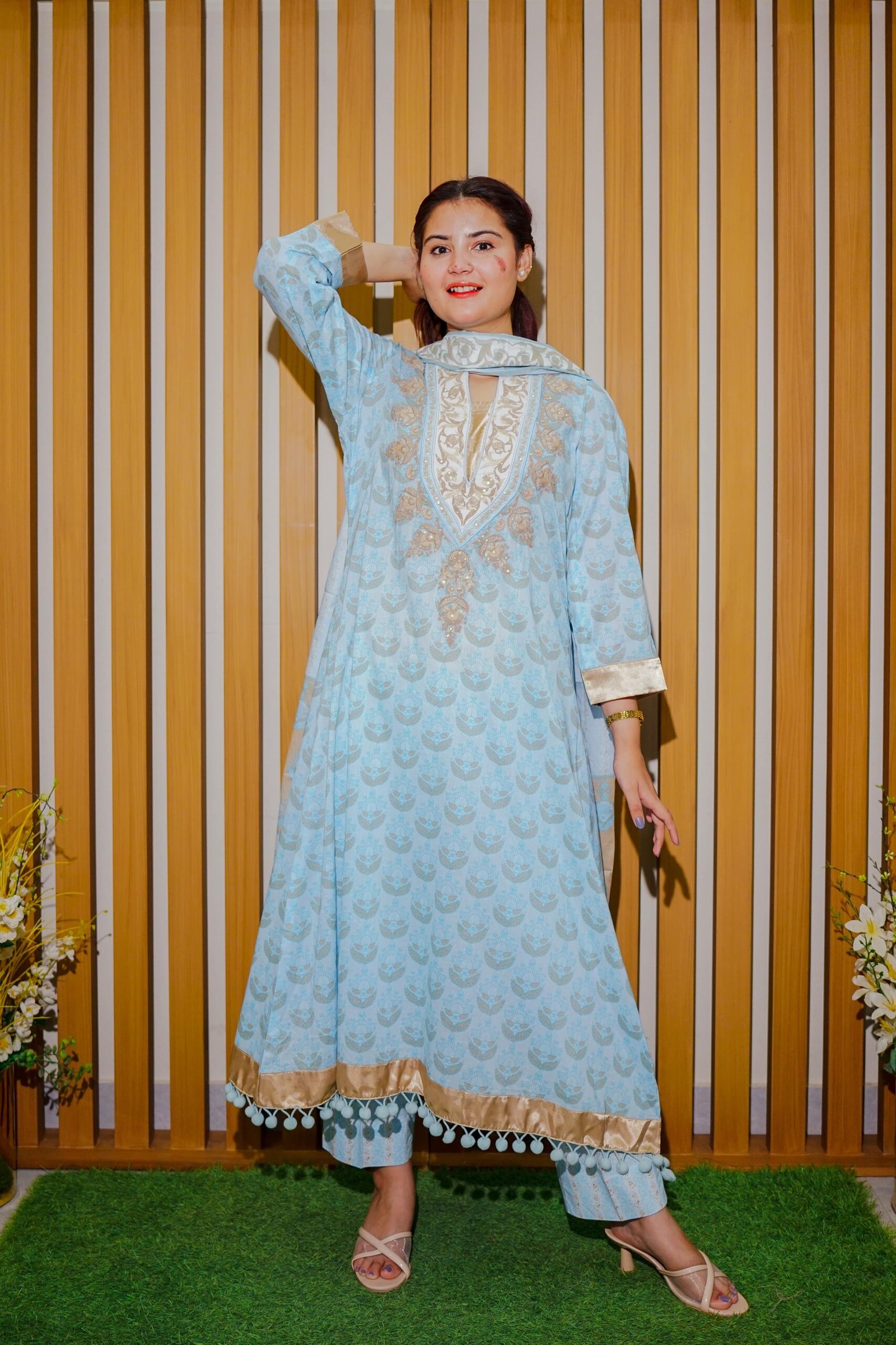 Dua Fashion Corner blends elegance and comfort with this premium 3-piece in a serene sky blue tone. The shirt showcases a delicately embroidered neckline with beige-gold detailing and unique tassel accents at the hem. Paired with printed straight trousers and a matching digitally printed dupatta, this look defines subtle sophistication.