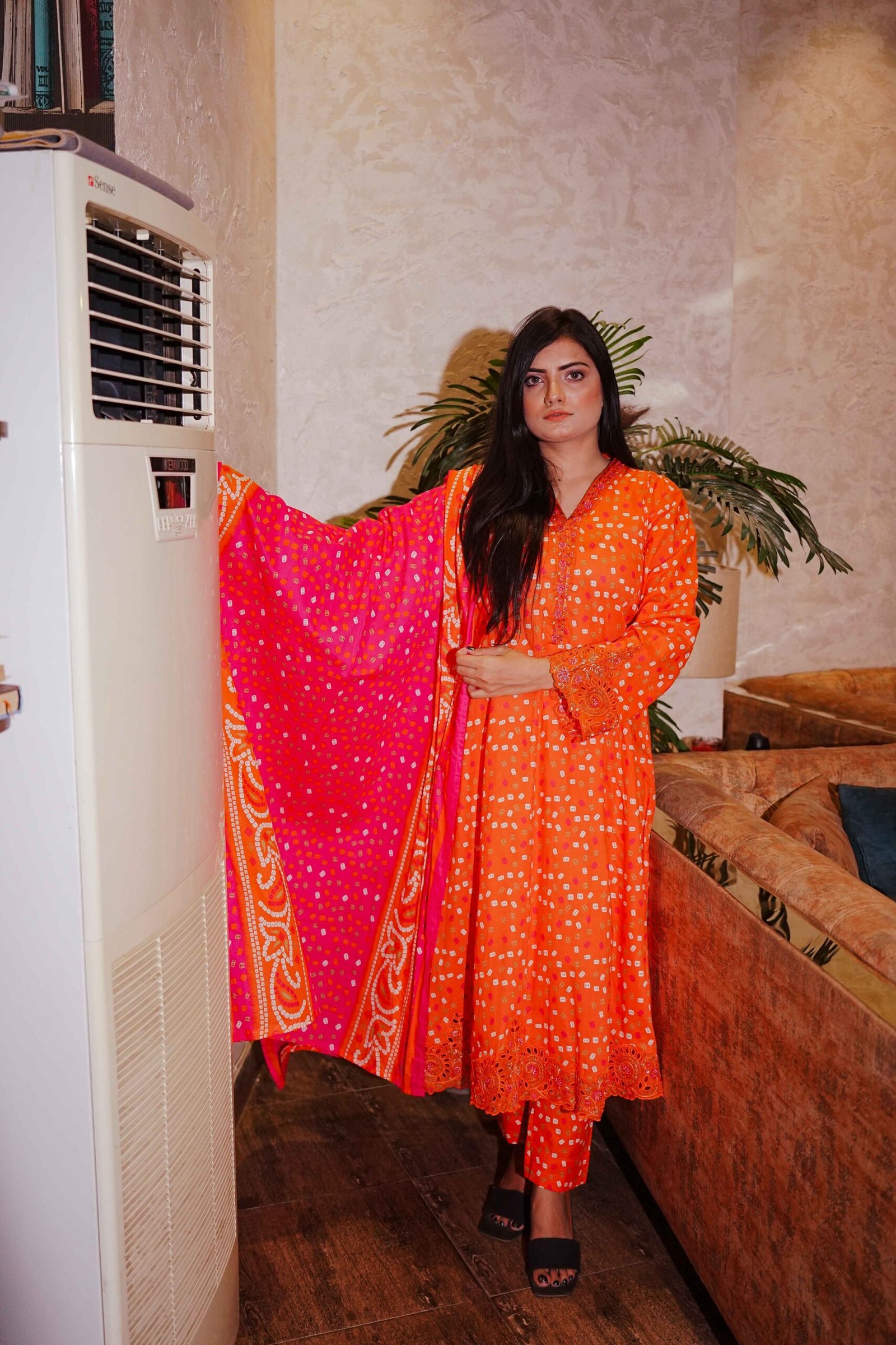 A bright and bold tangerine outfit featuring bandhani-style print, embroidered detailing, and a hot pink dupatta that adds the perfect festive finish.