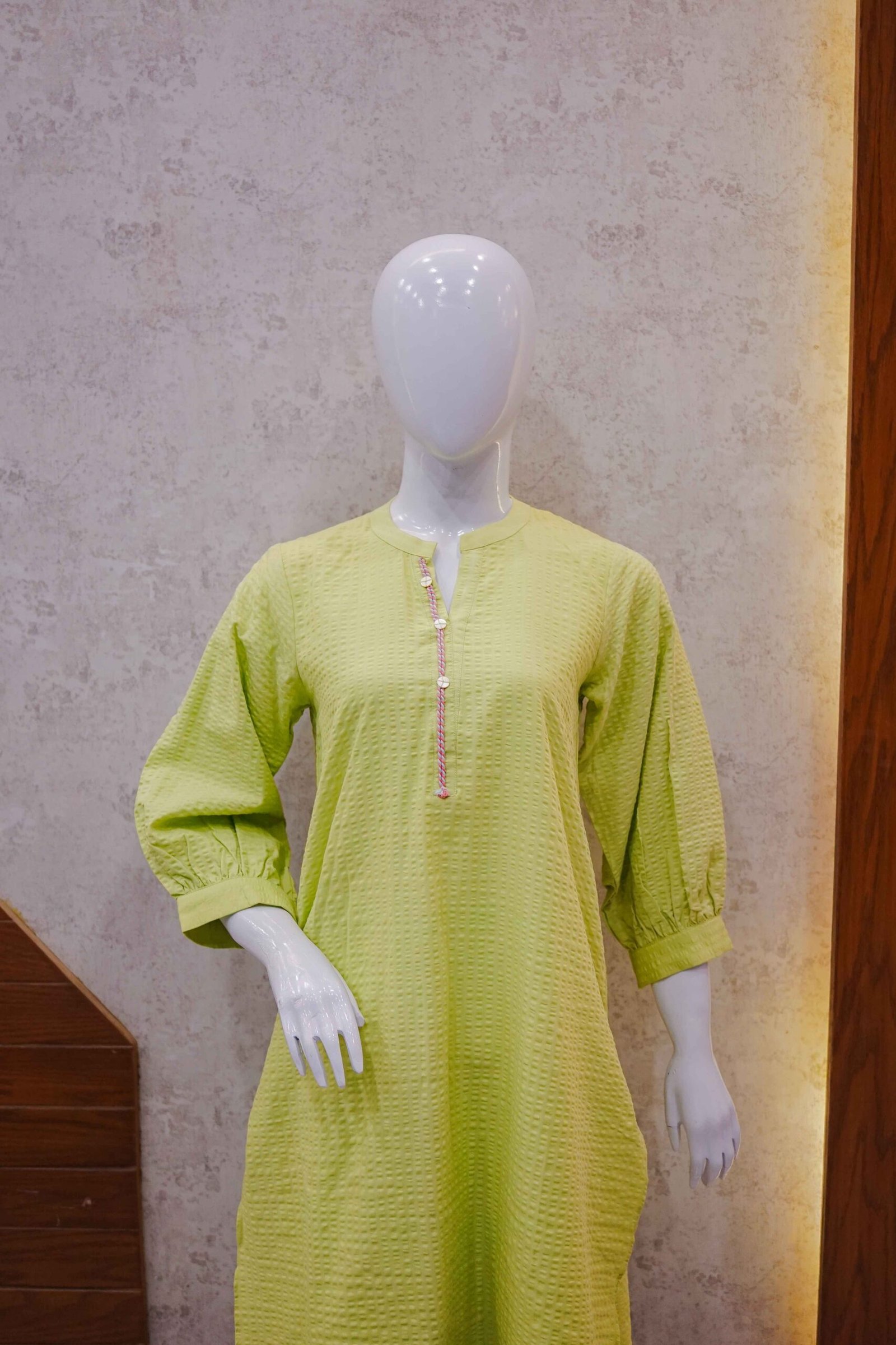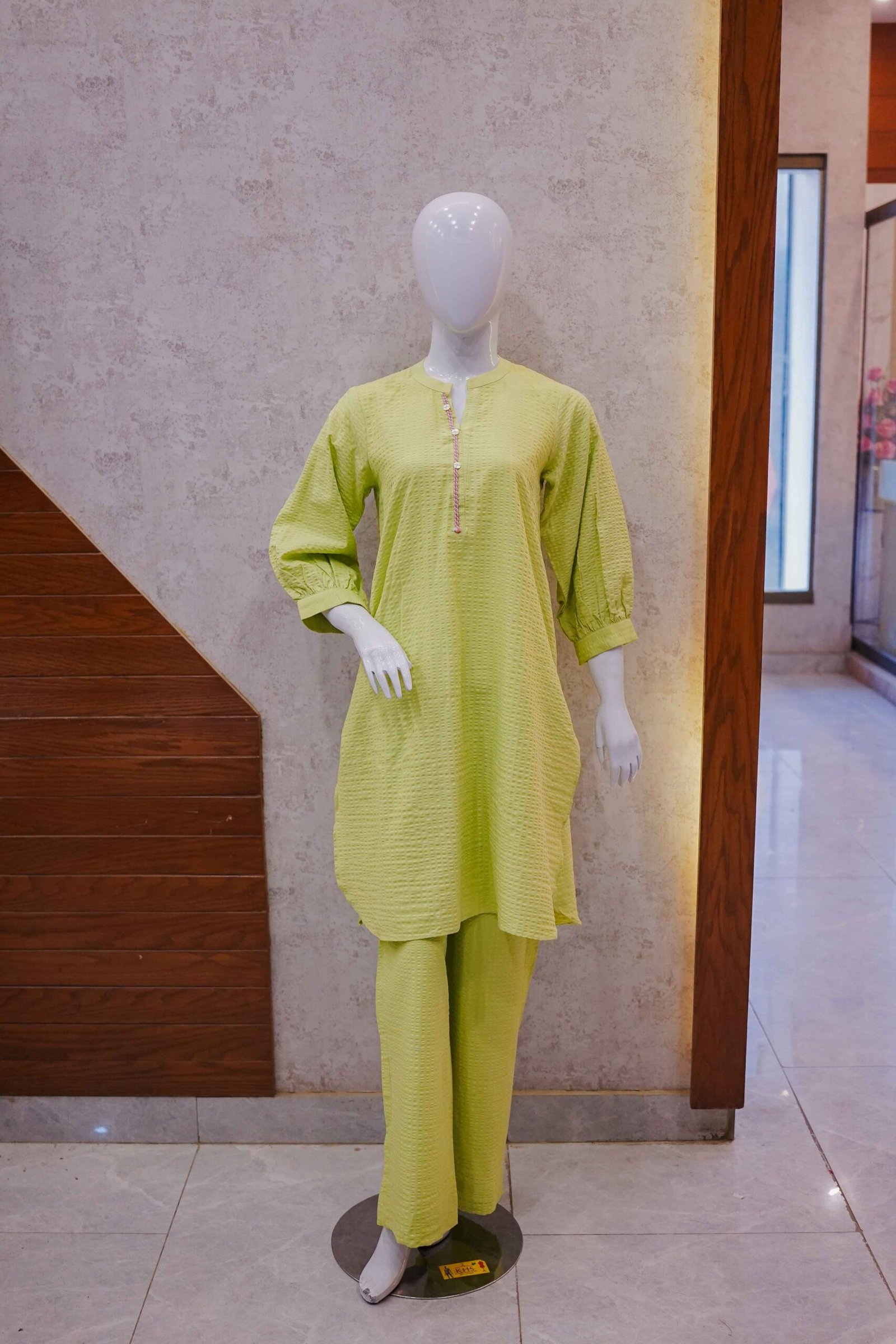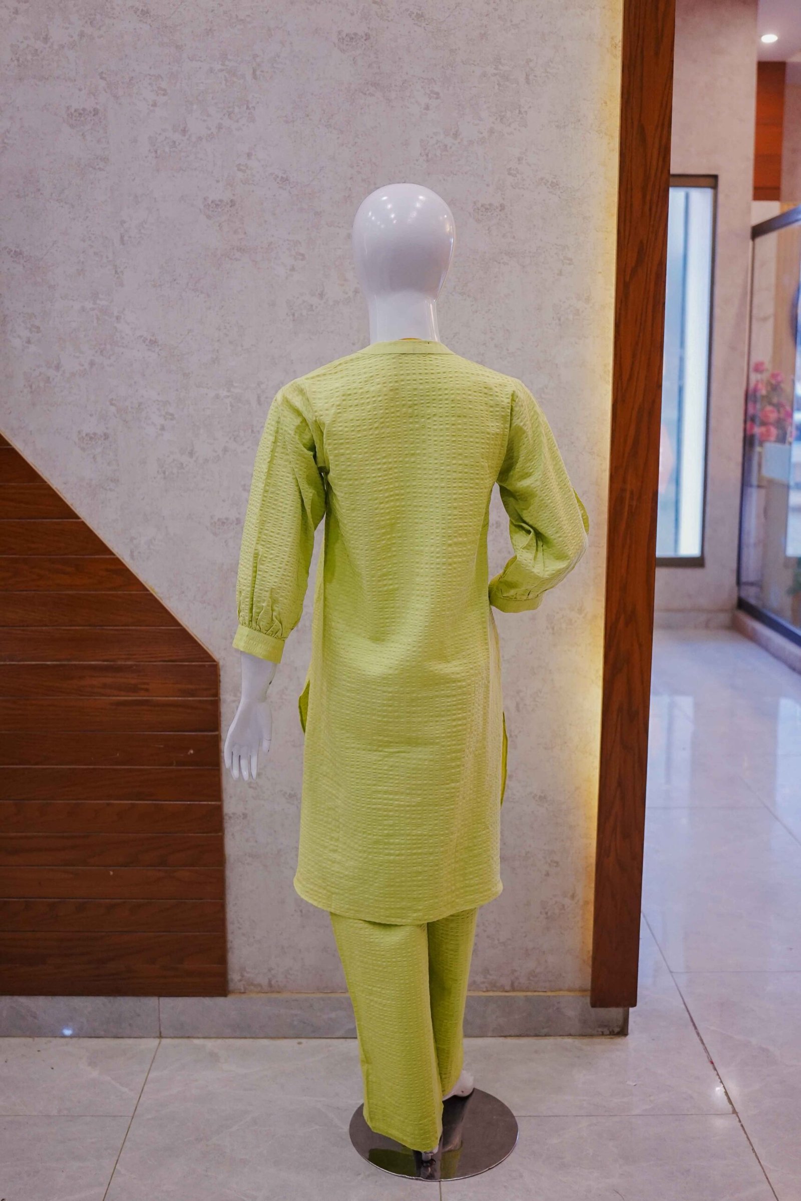 Step into cool comfort with this pastel lime green 2-piece set featuring a self-textured fabric that keeps it minimal yet modern. The kurta has a relaxed silhouette with a subtle placket detail, making it ideal for daywear, office, or casual hangouts.