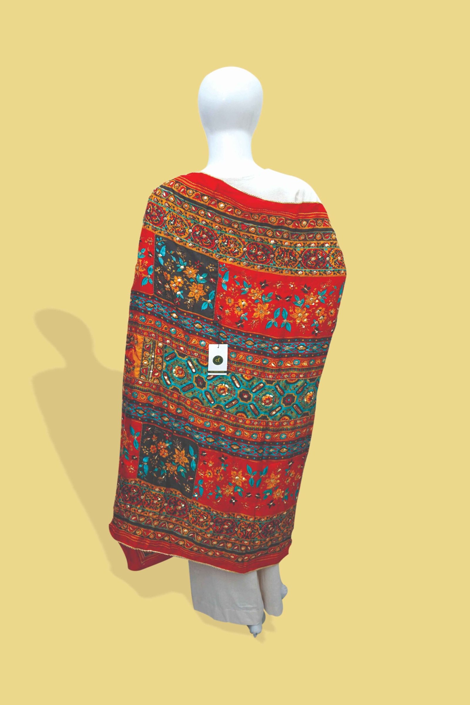 Embrace heritage with this breathtaking multicolor shawl from Dua Fashion Corner, crafted with intricate Rajasthani patchwork and delicate mirror embroidery. The shawl features vibrant hues of red, teal, black, and orange, adorned with floral motifs and ethnic patterns that reflect timeless tradition. Whether draped over formal wear or styled casually, this versatile shawl adds a regal touch to any outfit.