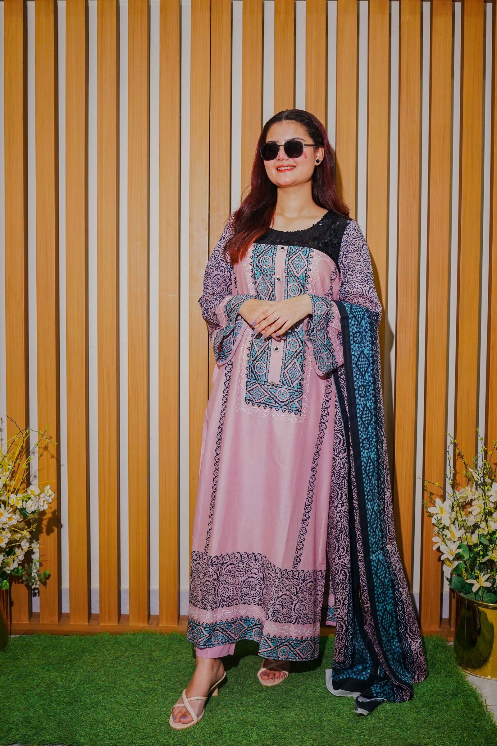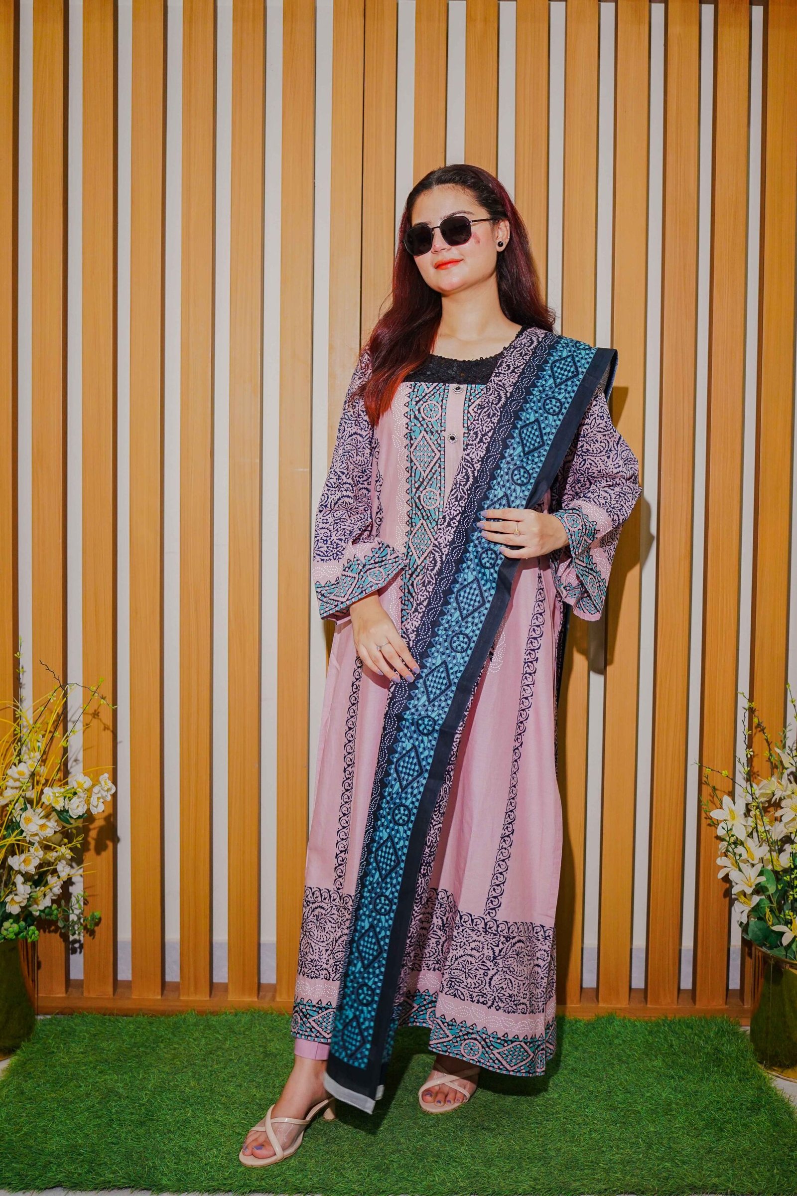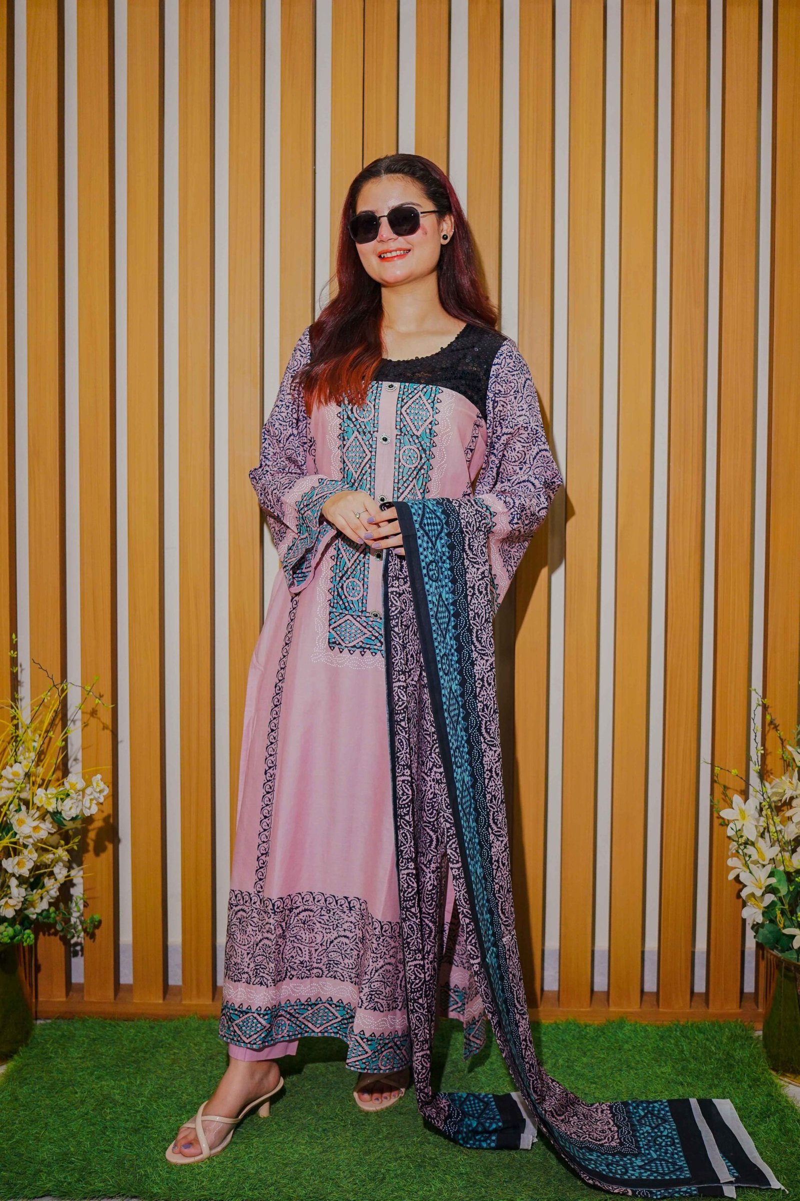 Add a fashionable twist to your ethnic wardrobe with this trendy pink lawn suit, designed for women who love a fusion of traditional and modern aesthetics. The kurta showcases detailed navy and teal ethnic prints with panel-style design, complemented by a contrasting blue geometric patterned dupatta. Tailored in a soft and breathable fabric, it ensures maximum comfort throughout the day. Perfect for casual outings, brunches, or even semi-formal events, this suit pairs effortlessly with heels or flats for a complete look. Step out in confidence and grace this season in this stylish printed lawn ensemble.