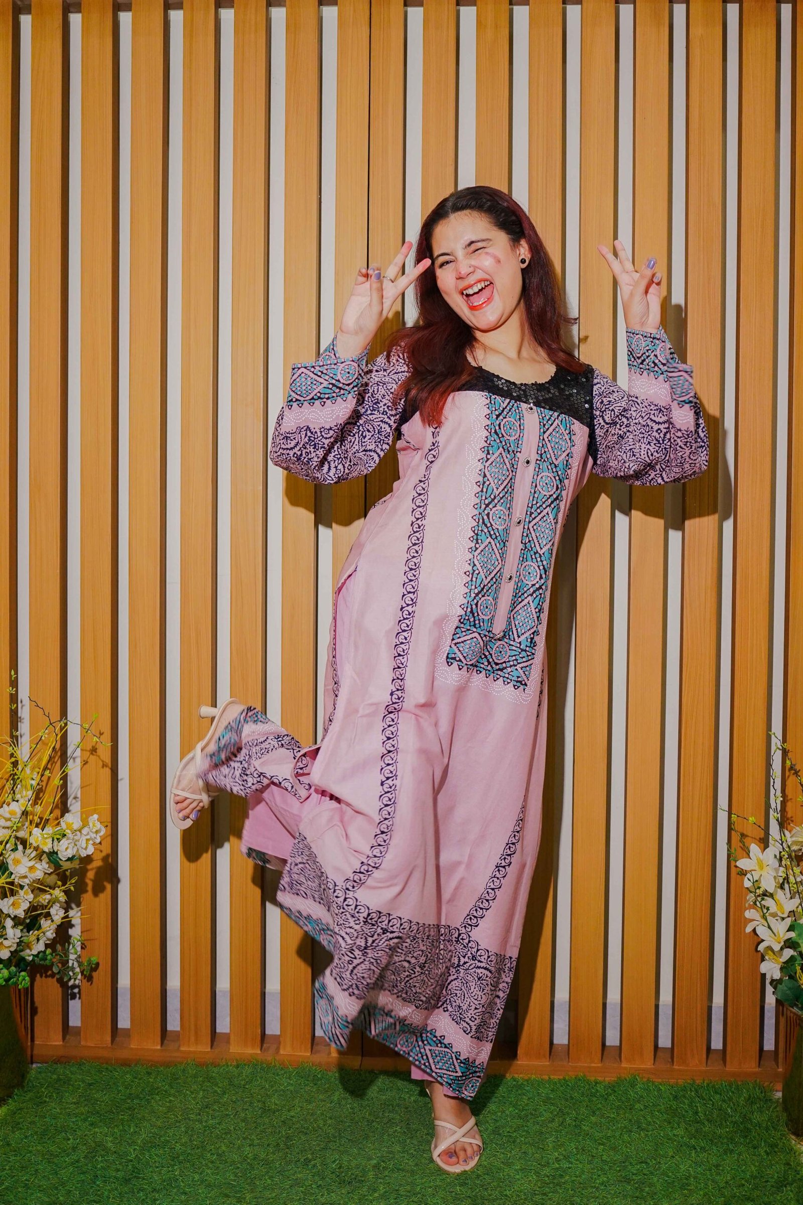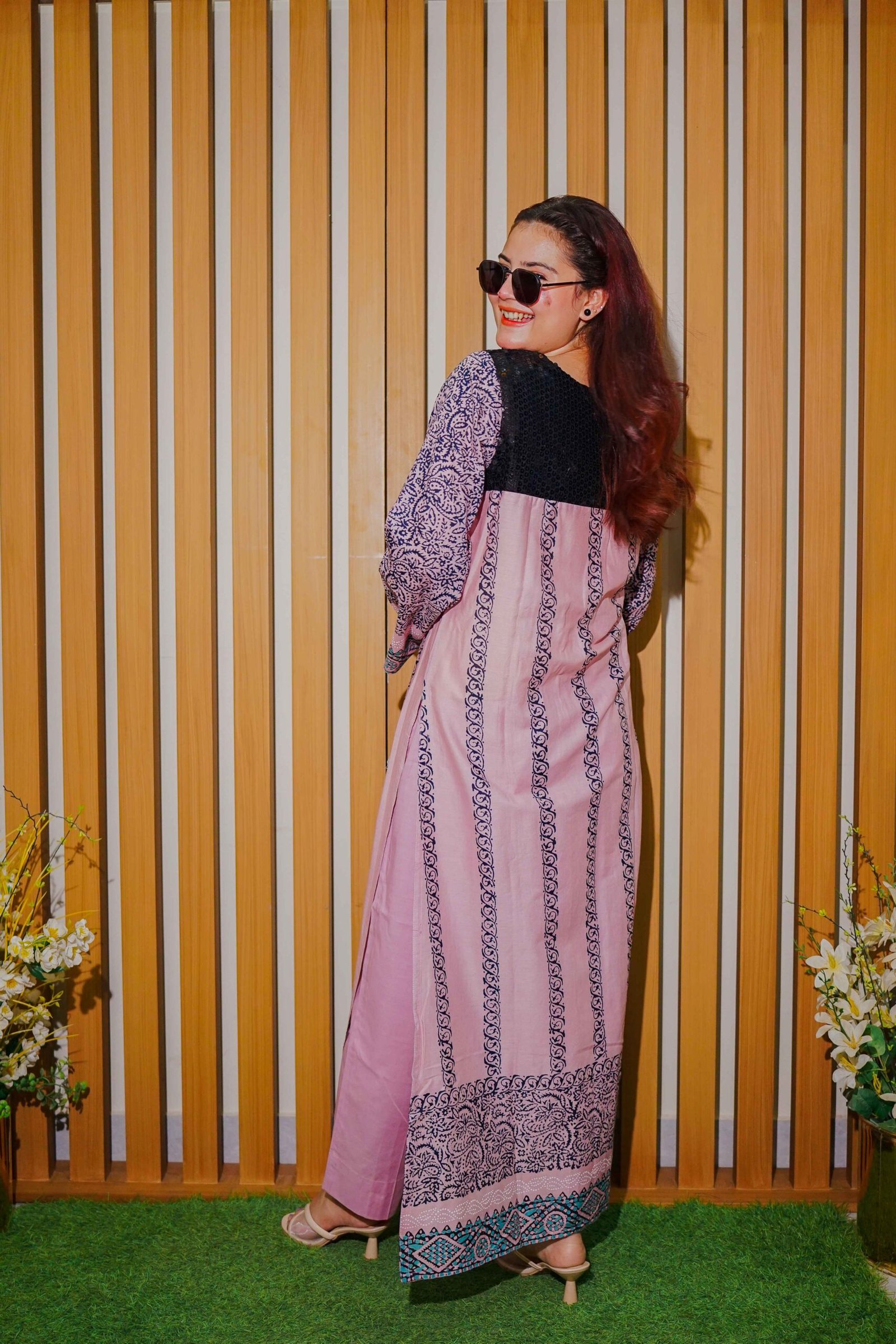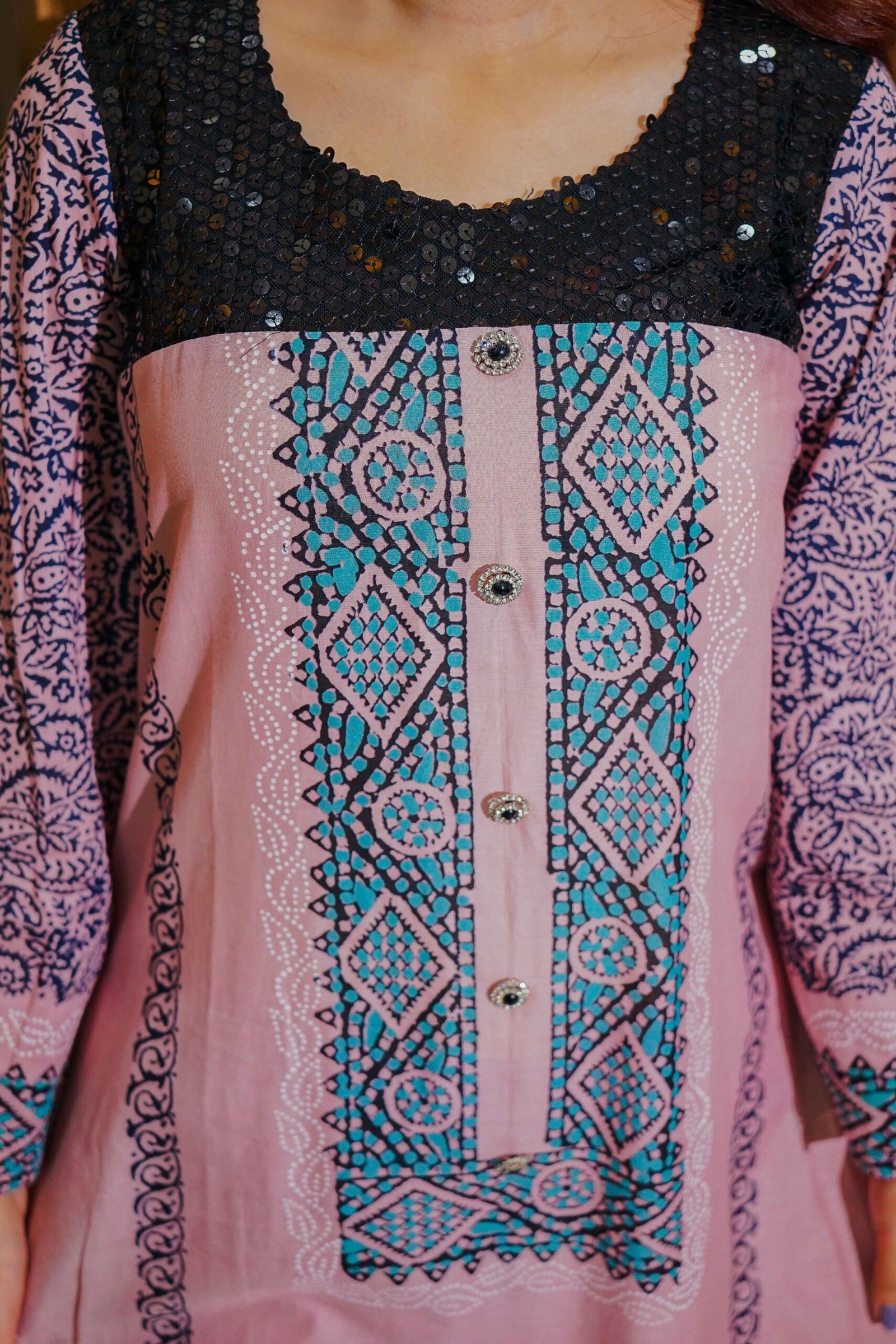 Add a fashionable twist to your ethnic wardrobe with this trendy pink lawn suit, designed for women who love a fusion of traditional and modern aesthetics. The kurta showcases detailed navy and teal ethnic prints with panel-style design, complemented by a contrasting blue geometric patterned dupatta. Tailored in a soft and breathable fabric, it ensures maximum comfort throughout the day. Perfect for casual outings, brunches, or even semi-formal events, this suit pairs effortlessly with heels or flats for a complete look. Step out in confidence and grace this season in this stylish printed lawn ensemble.