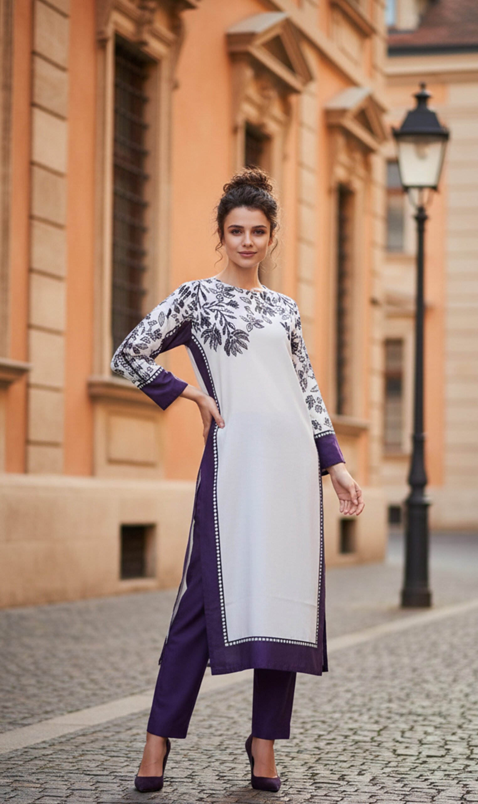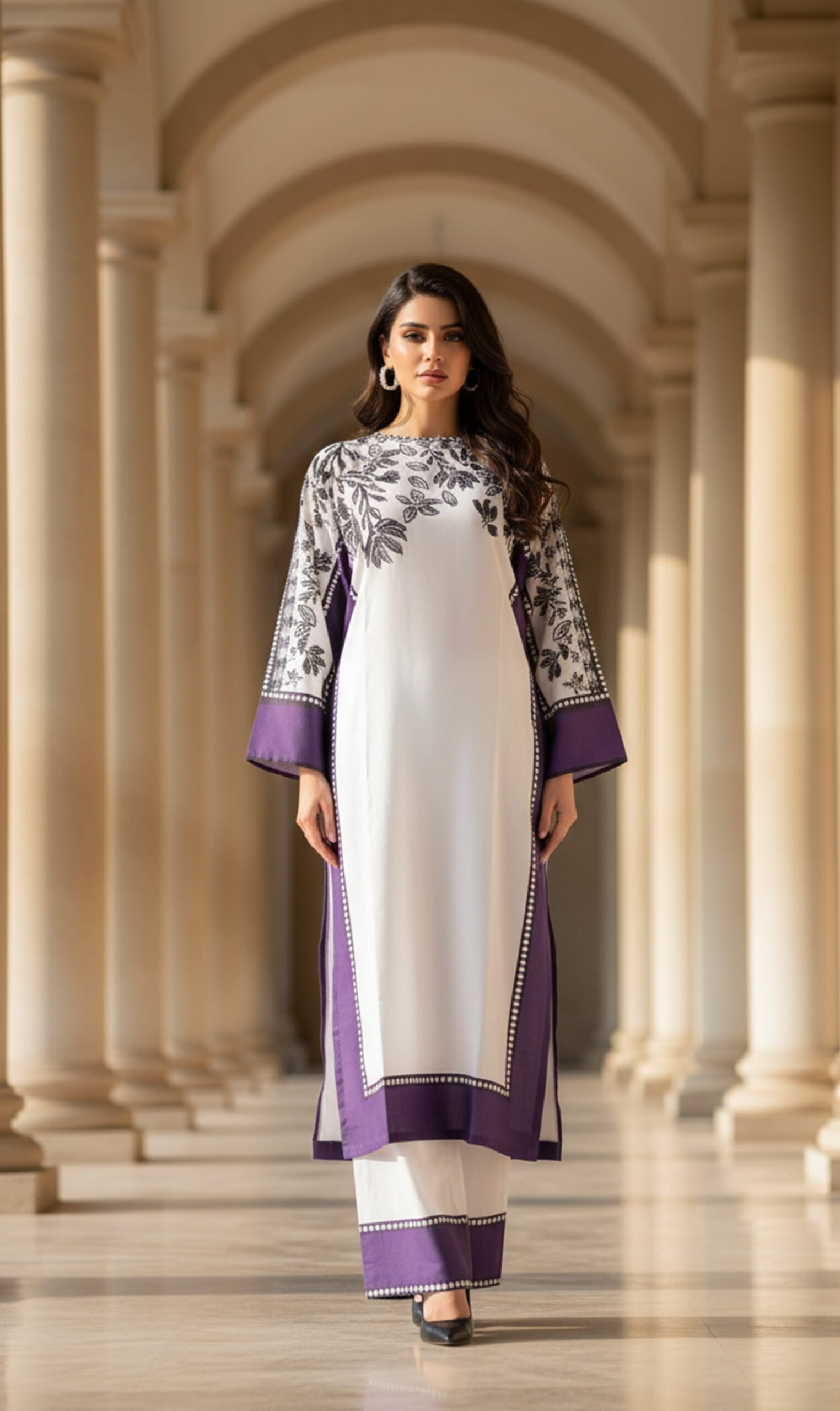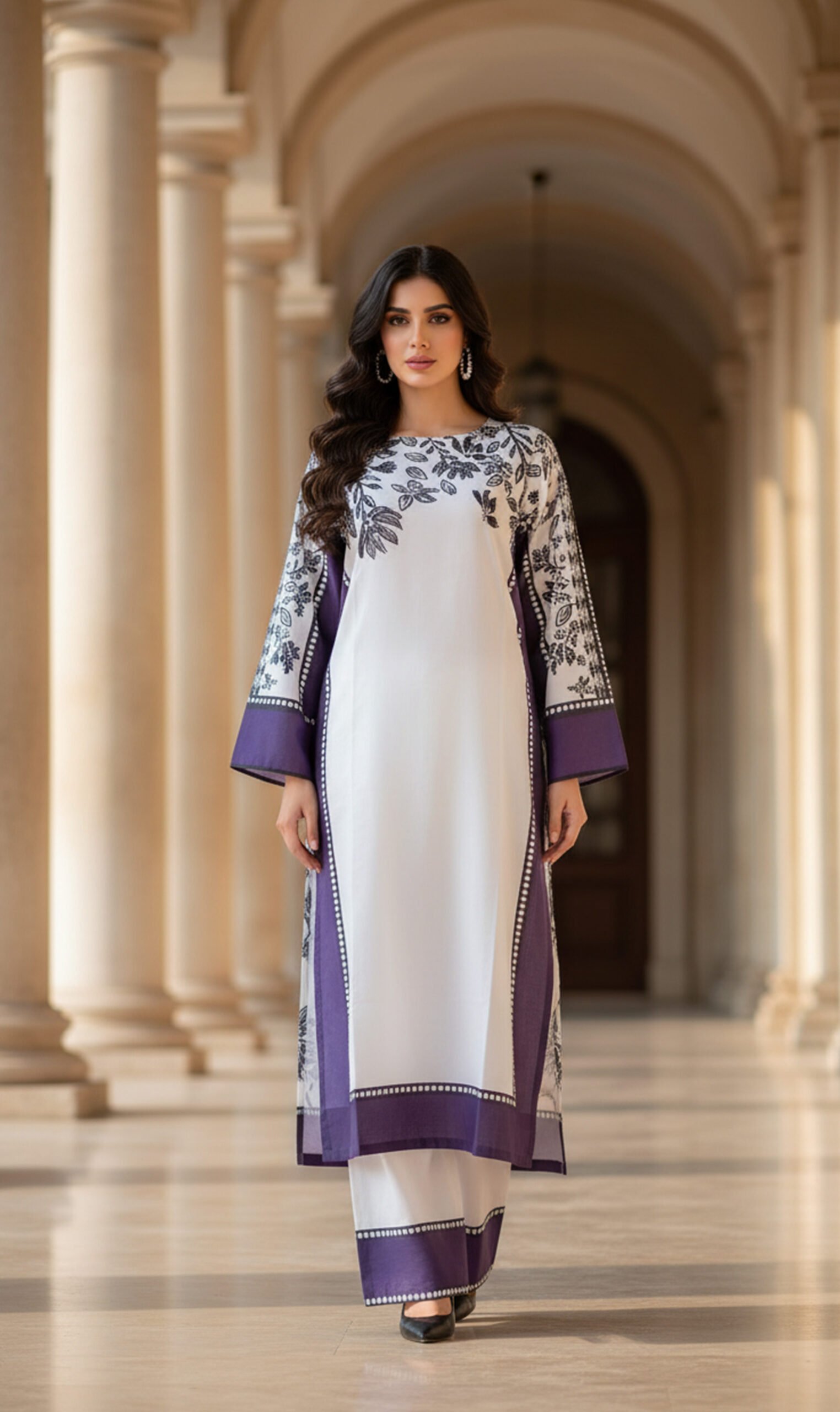 Elevate your style with this stunning silk creation from Dua Fashion Corner. The serene white base, framed with rich violet borders, features intricate black floral motifs that exude understated elegance. The luxurious silk fabric drapes beautifully, offering both comfort and a refined finish — ideal for gatherings, formal lunches, or festive evenings.