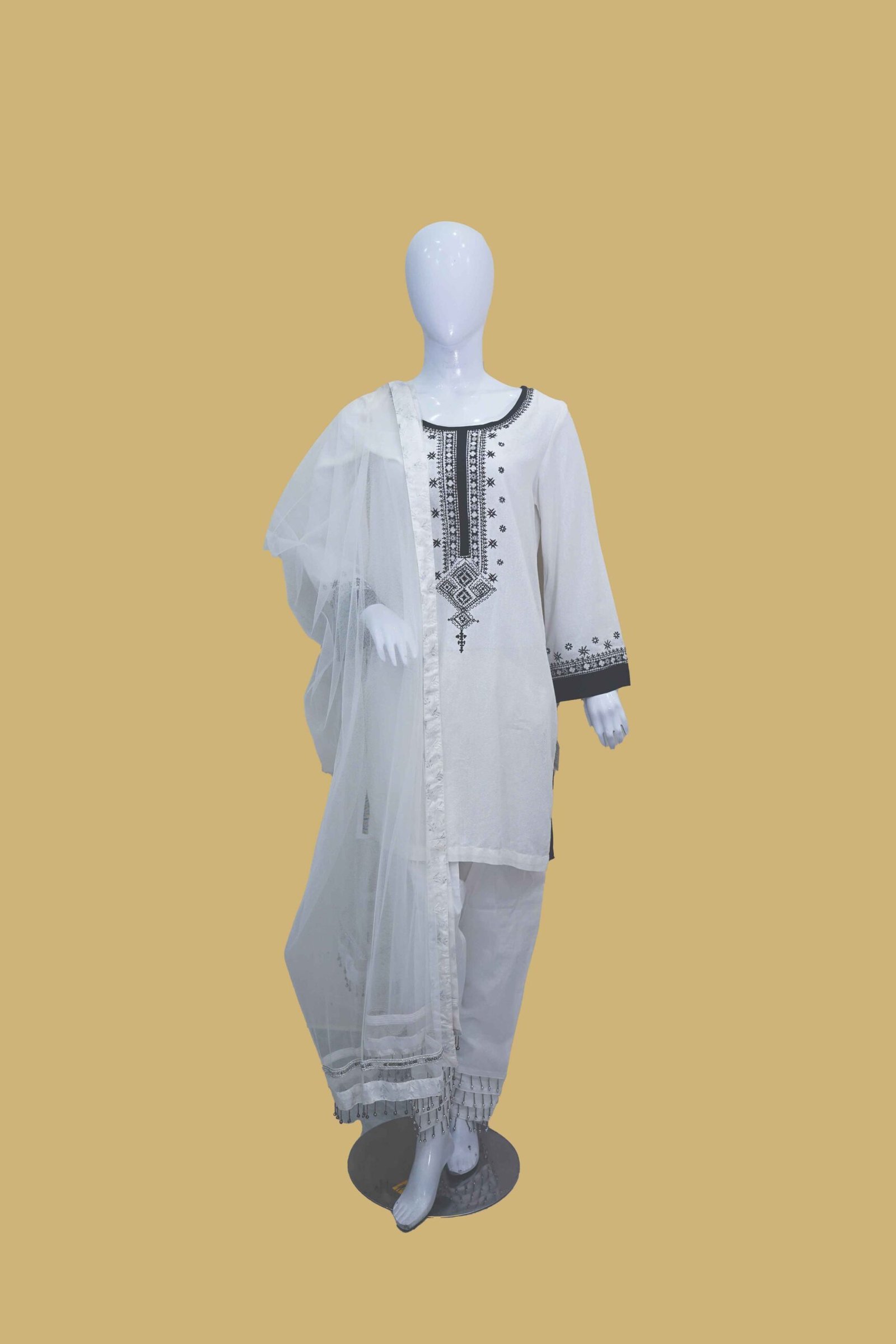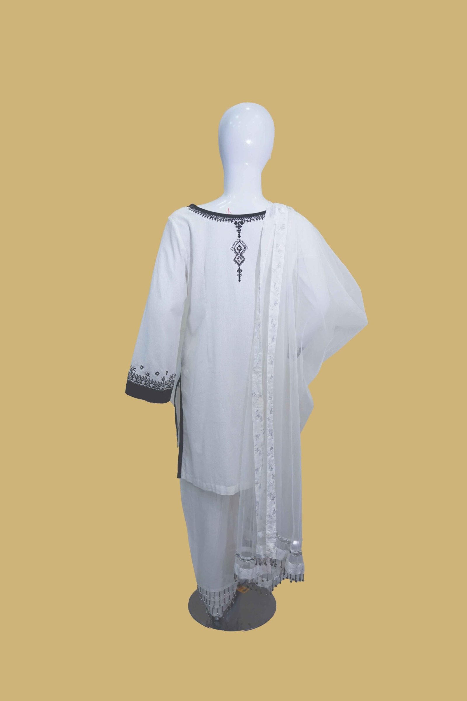 Be the first to review “White & Black Embroidered Cotton Suit with Net Dupatta”