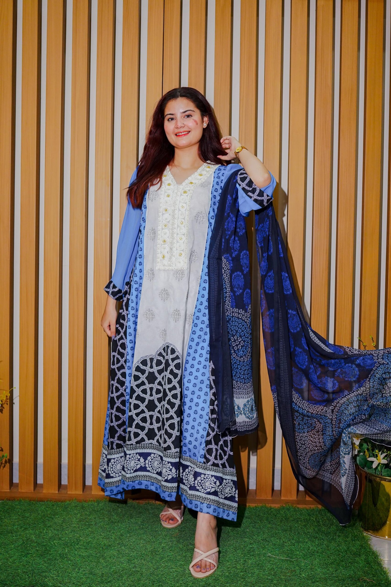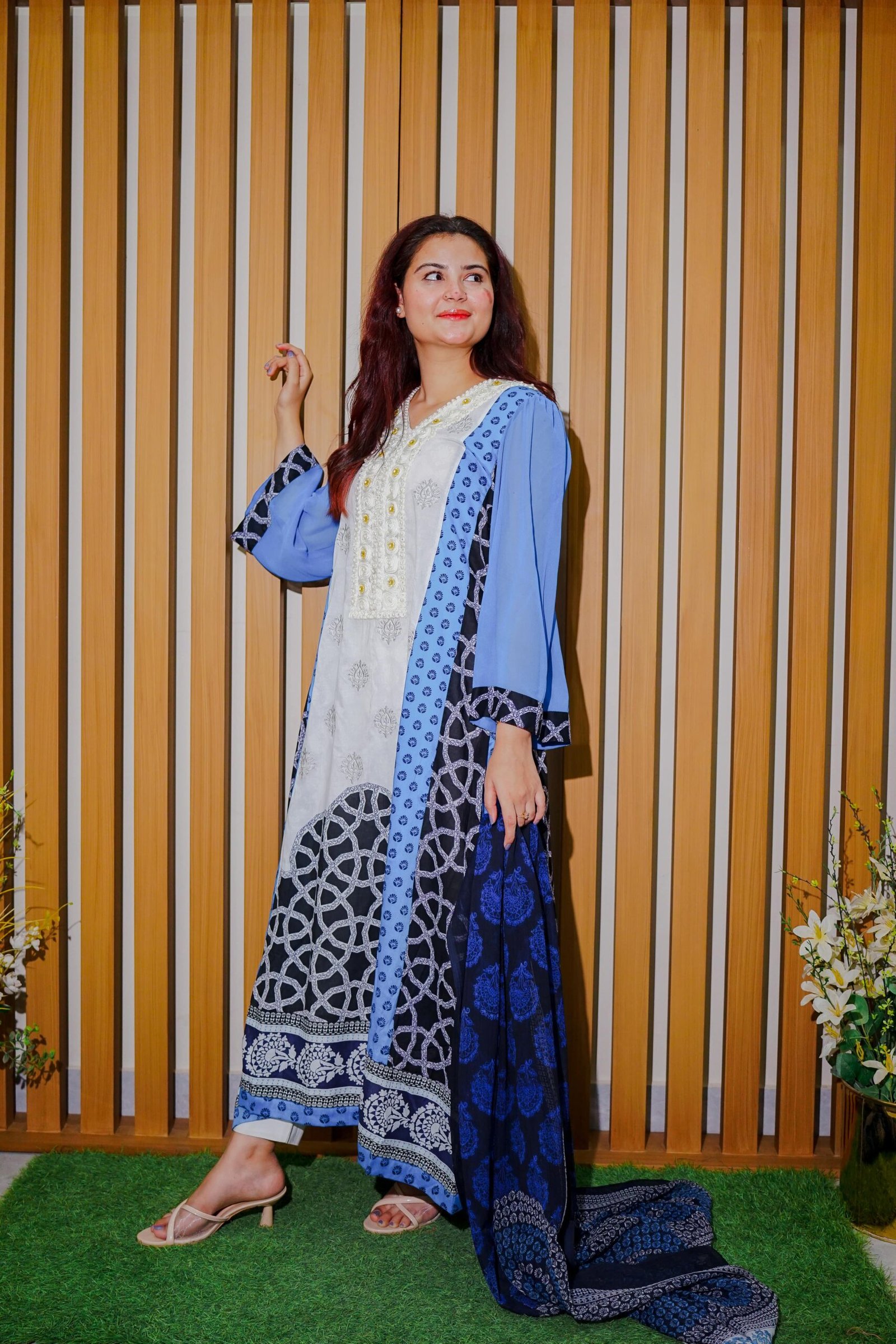 Grace meets sophistication in this beautifully crafted 3-piece suit featuring a white base with blue and black digital prints. The shirt showcases intricate embroidery along the neckline with elegant button details that add a refined finish. Paired with a matching printed dupatta and trousers, this outfit is a timeless choice for casual gatherings, office days, or festive wear.