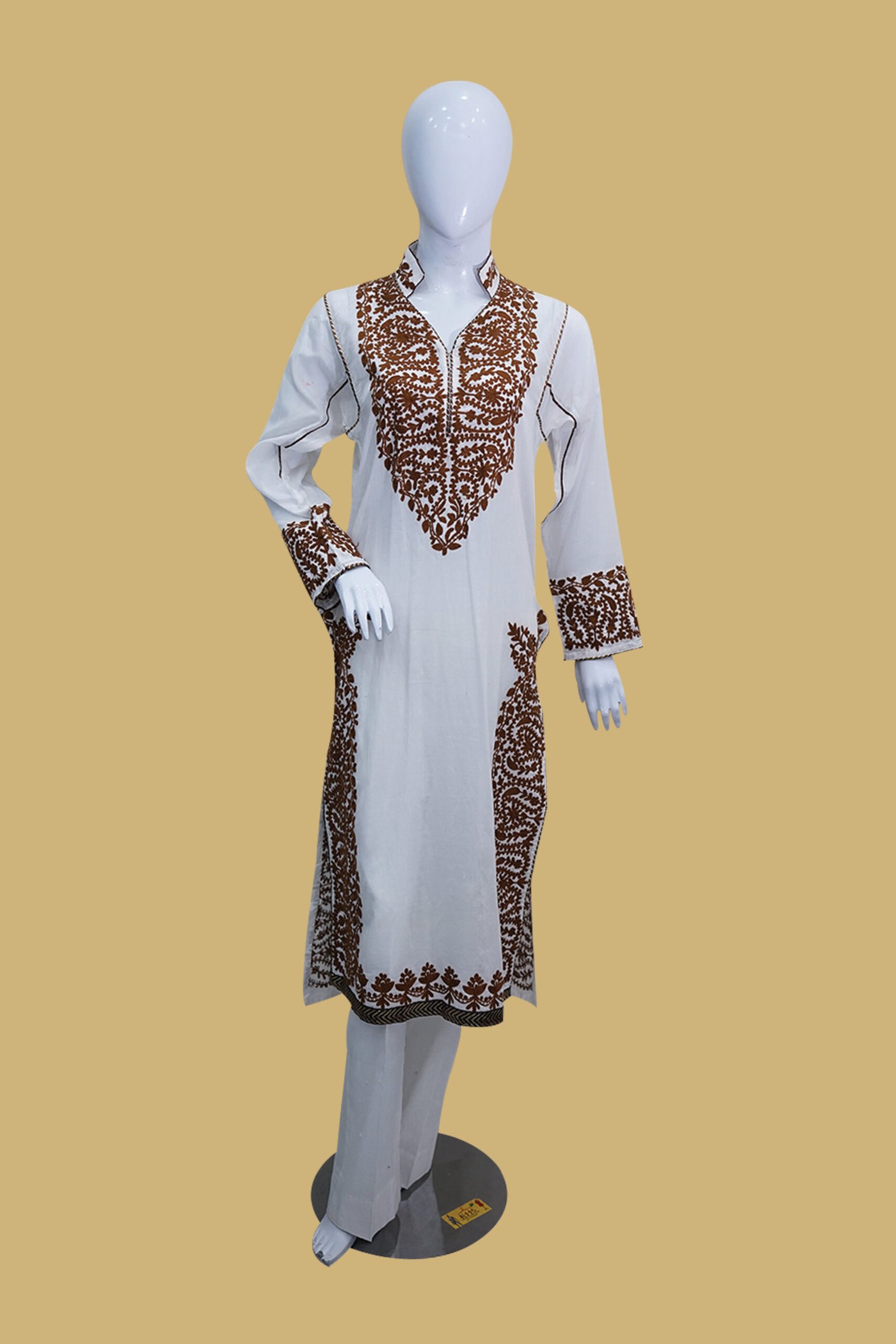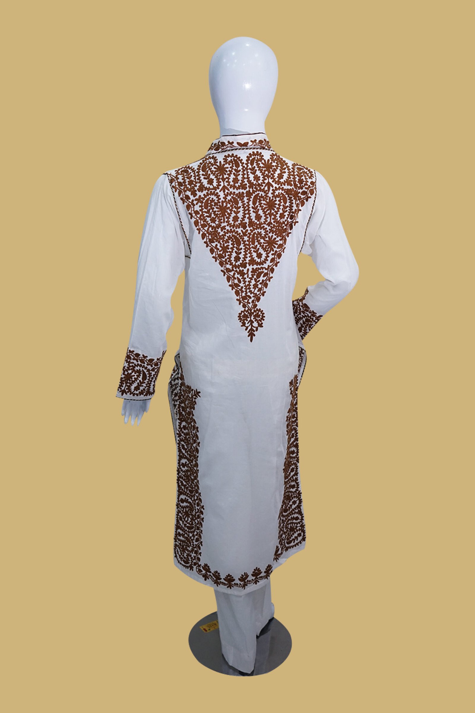 Elevate your wardrobe with this stunning white embroidered ensemble from Dua Fashion Corner. Crafted from premium-quality soft cotton fabric, this outfit offers both elegance and comfort for everyday or semi-formal wear. The design features intricate rust brown Kashmiri-style embroidery on the neckline, cuffs, hemline, and side panels, creating a sophisticated traditional look. The stand collar with front slit adds a touch of modernity, while the straight-cut silhouette flatters all body types. Perfect for cultural events, office wear, or casual gatherings, this piece balances simplicity and statement beautifully.